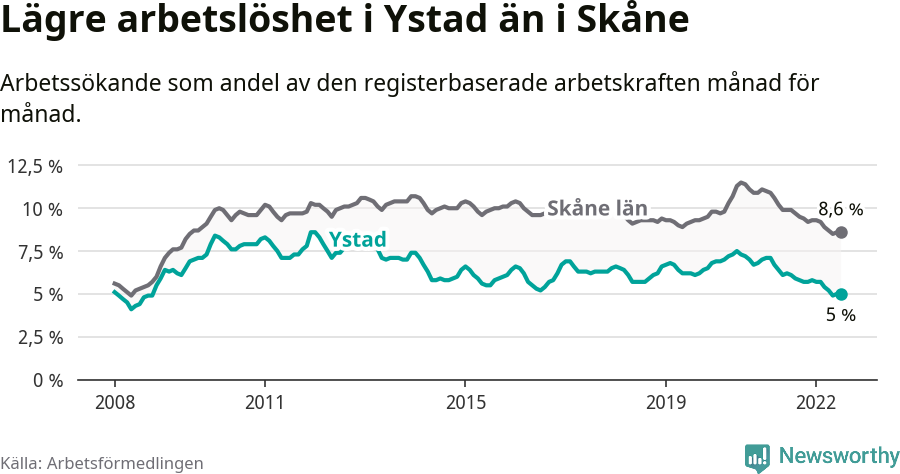 Det är 17:e månaden i följd som arbetslösheten i Ystad är lägre än den var under samma tidpunkt året innan. Sedan februari 2021 har arbetslösheten gått ner från 7,1 till 5,0 procent.