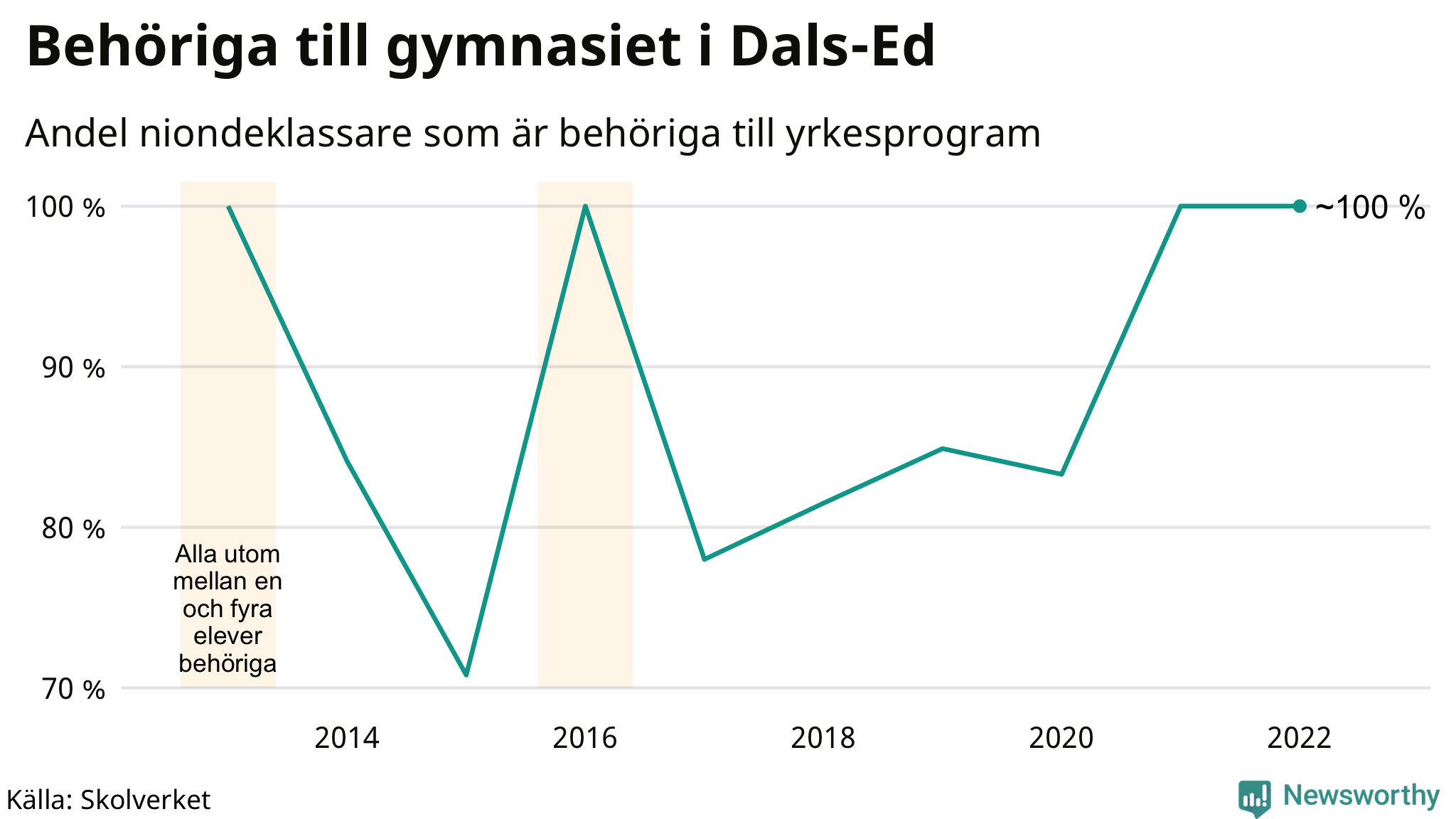 Nästan alla elever som gick ut nian i Dals-Ed i våras var behöriga till gymnasiets yrkesprogram, precis som året innan. Någonstans mellan 51 och 54 av de 55 eleverna som slutade nian i våras klarade behörigheten, och Dals-Ed tillhör de elva kommuner där färre än fem elever inte blev behöriga till yrkesgymnasiet.Dals-Ed tillhör de elva kommuner i landet där färre än fem elever inte nådde behörighet.
