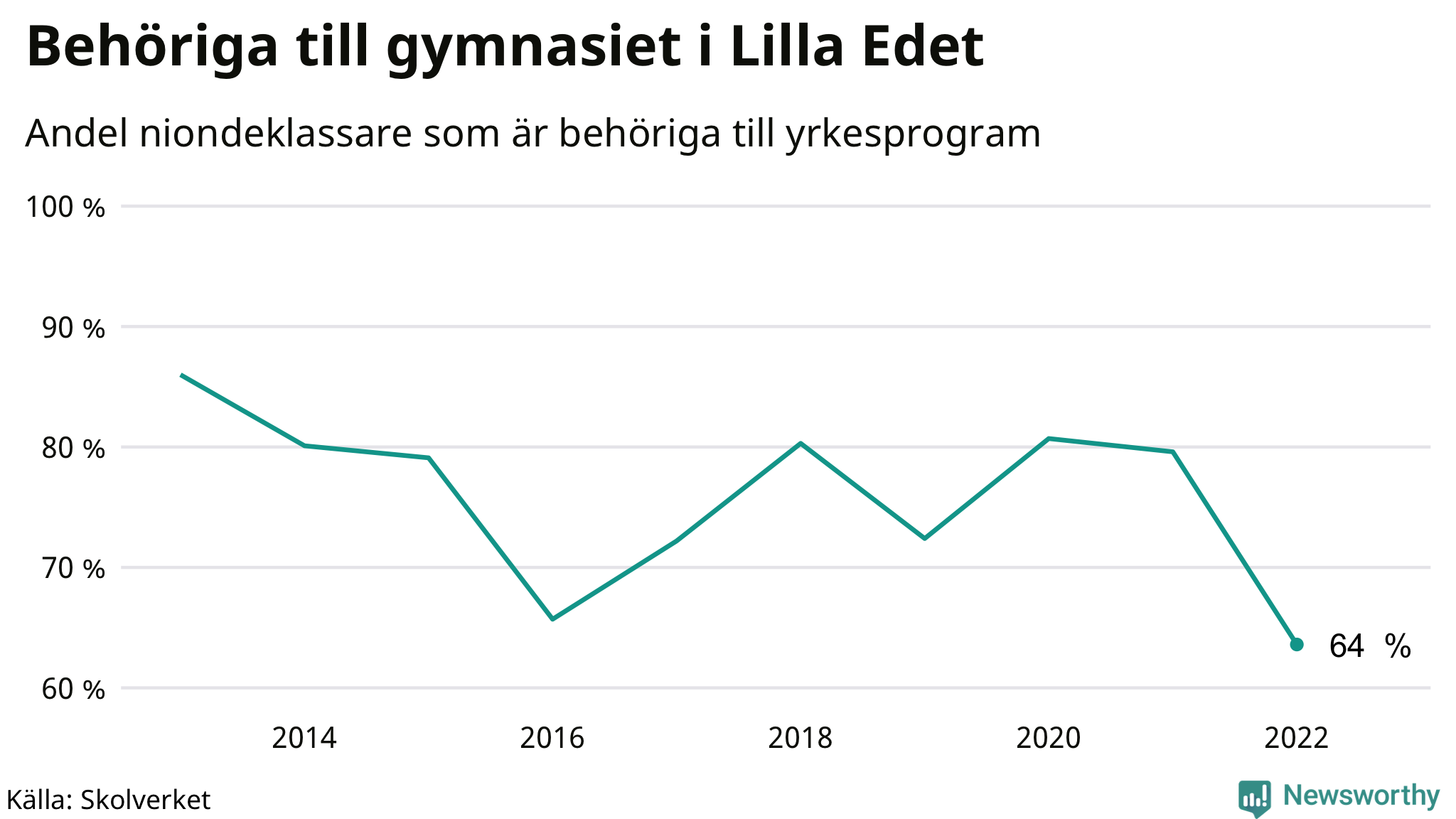 Av de niondeklassare som gick ut i Lilla Edet i våras var 64 procent behöriga till gymnasiets yrkesprogram. Det är den lägsta andelen i kommunen under det senaste decenniet, visar Skolverkets statistik som släpptes i dag.