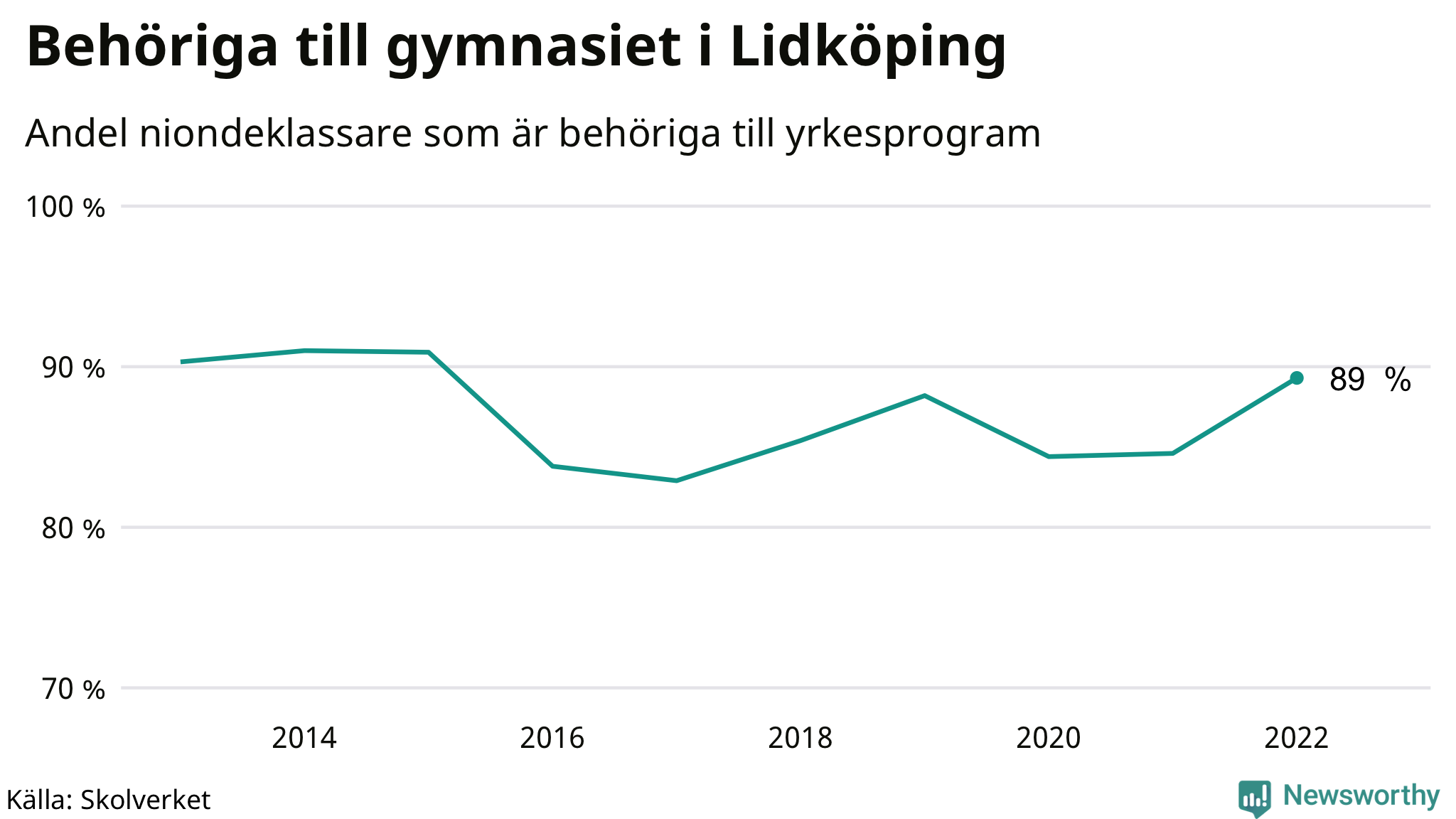 89 procent av eleverna som gick ut nian i Lidköping i våras var behöriga till gymnasiets yrkesprogram. Det är en högre andel än bland dem som gick ur nian våren 2021. Högst andel niondeklassare som var behöriga till gymnasiet i Västra Götalands län i våras fanns i Orusts kommun (91 procent). Lägst var andelen i Lilla Edets kommun (64 procent). I ytterligare två kommuner i länet var det bara en eller några få som inte klarade behörigheten.