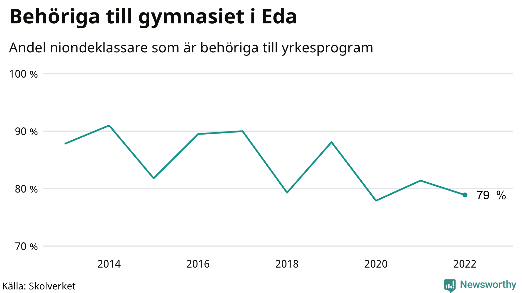 79 procent av eleverna som gick ut nian i Eda i våras var behöriga till gymnasiets yrkesprogram. Det är en lägre andel än bland dem som gick ur nian våren 2021. Högst andel niondeklassare som var behöriga till gymnasiet i Värmlands län i våras fanns i Hammarö kommun (94 procent). Lägst var andelen i Sunne kommun (75 procent).