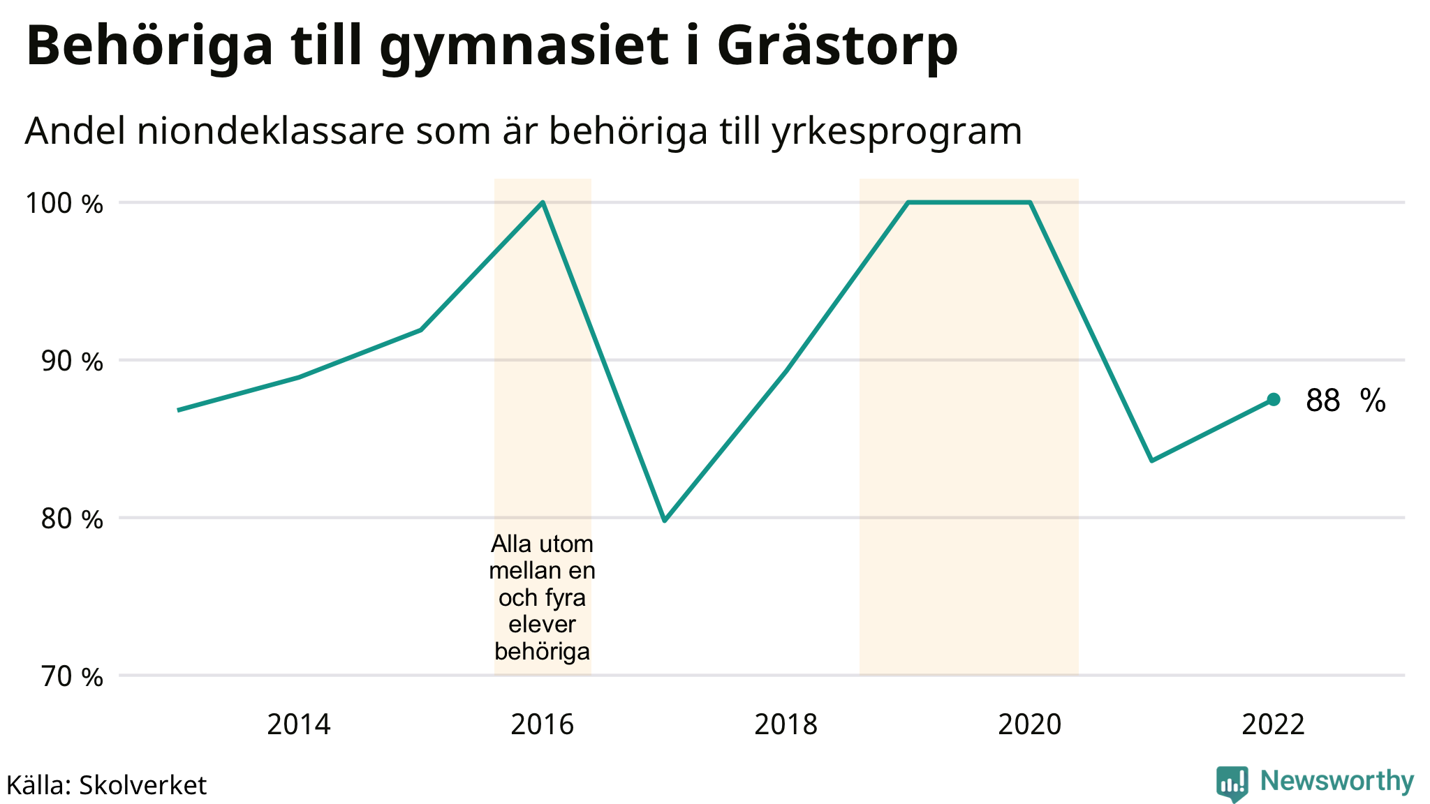 88 procent av eleverna som gick ut nian i Grästorp i våras var behöriga till gymnasiets yrkesprogram. Det är en högre andel än bland dem som gick ur nian våren 2021. Högst andel niondeklassare som var behöriga till gymnasiet i Västra Götalands län i våras fanns i Orusts kommun (91 procent). Lägst var andelen i Lilla Edets kommun (64 procent). I ytterligare två kommuner i länet var det bara en eller några få som inte klarade behörigheten.
