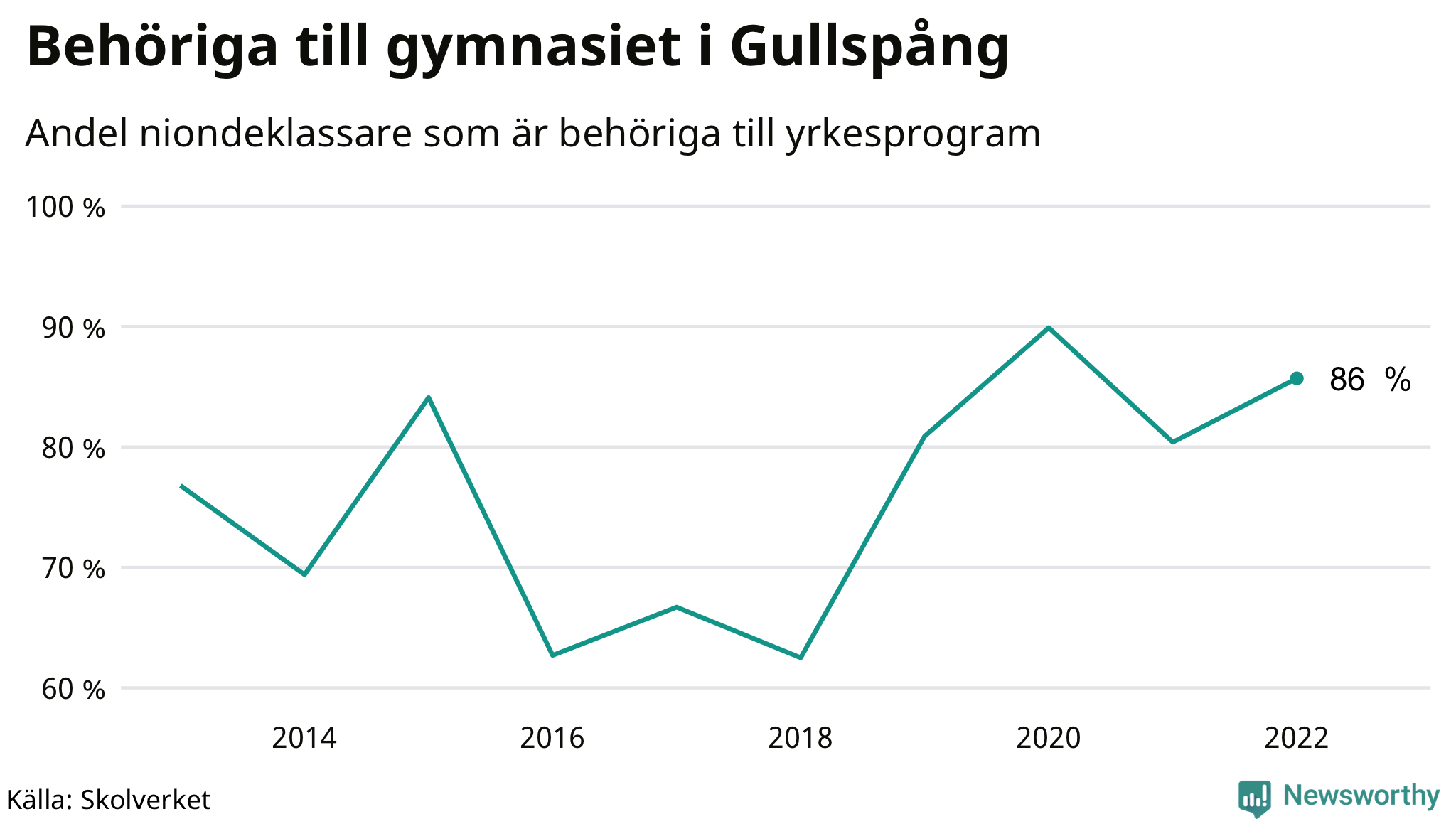 86 procent av eleverna som gick ut nian i Gullspång i våras var behöriga till gymnasiets yrkesprogram. Det är en högre andel än bland dem som gick ur nian våren 2021. Högst andel niondeklassare som var behöriga till gymnasiet i Västra Götalands län i våras fanns i Orusts kommun (91 procent). Lägst var andelen i Lilla Edets kommun (64 procent). I ytterligare två kommuner i länet var det bara en eller några få som inte klarade behörigheten.