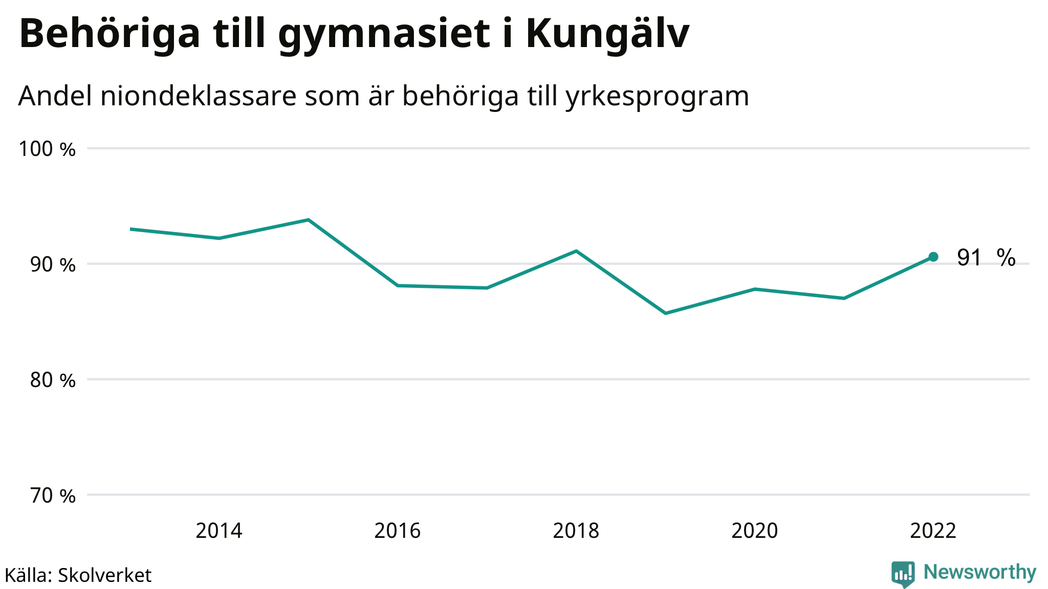 91 procent av eleverna som gick ut nian i Kungälv i våras var behöriga till gymnasiets yrkesprogram. Det är en högre andel än bland dem som gick ur nian våren 2021. Högst andel niondeklassare som var behöriga till gymnasiet i Västra Götalands län i våras fanns i Orusts kommun (91 procent). Lägst var andelen i Lilla Edets kommun (64 procent). I ytterligare två kommuner i länet var det bara en eller några få som inte klarade behörigheten.