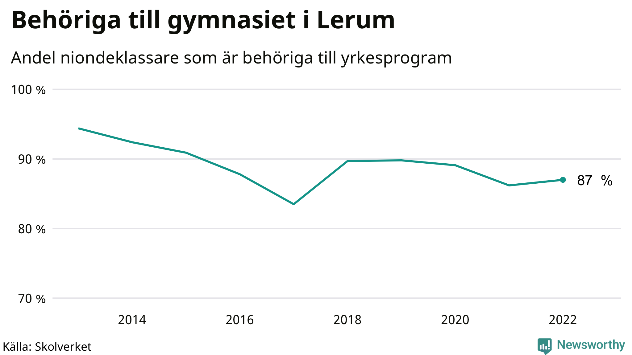 Av de niondeklassare som gick ut i Lerum i våras var 87 procent behöriga till gymnasiets yrkesprogram. Det visar Skolverkets statistik som släpptes i dag.
