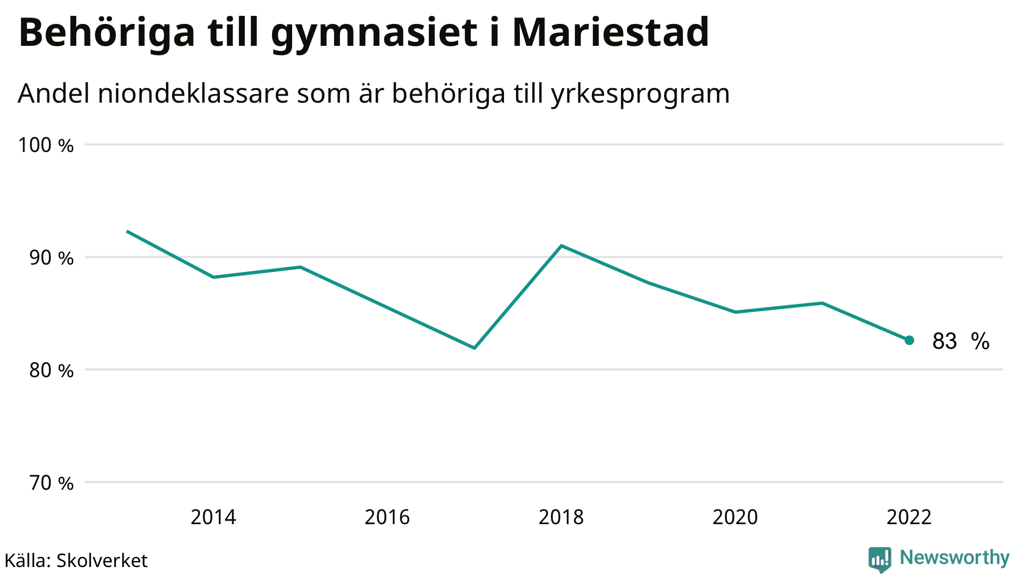 83 procent av eleverna som gick ut nian i Mariestad i våras var behöriga till gymnasiets yrkesprogram. Det är en lägre andel än bland dem som gick ur nian våren 2021. Högst andel niondeklassare som var behöriga till gymnasiet i Västra Götalands län i våras fanns i Orusts kommun (91 procent). Lägst var andelen i Lilla Edets kommun (64 procent). I ytterligare två kommuner i länet var det bara en eller några få som inte klarade behörigheten.