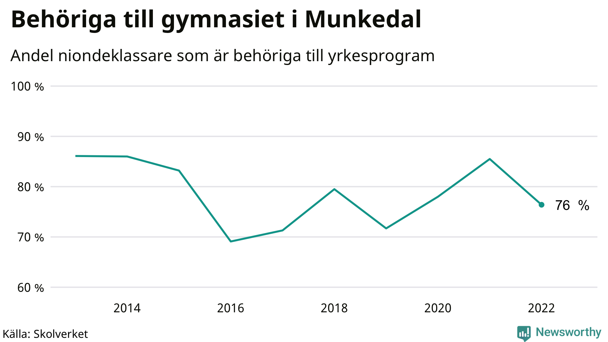 76 procent av eleverna som gick ut nian i Munkedal i våras var behöriga till gymnasiets yrkesprogram. Det är en lägre andel än bland dem som gick ur nian våren 2021. Högst andel niondeklassare som var behöriga till gymnasiet i Västra Götalands län i våras fanns i Orusts kommun (91 procent). Lägst var andelen i Lilla Edets kommun (64 procent). I ytterligare två kommuner i länet var det bara en eller några få som inte klarade behörigheten.