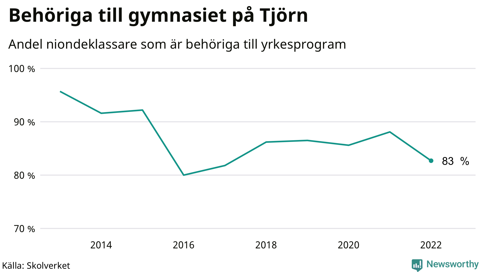 83 procent av eleverna som gick ut nian på Tjörn i våras var behöriga till gymnasiets yrkesprogram. Det är en lägre andel än bland dem som gick ur nian våren 2021. Högst andel niondeklassare som var behöriga till gymnasiet i Västra Götalands län i våras fanns i Orusts kommun (91 procent). Lägst var andelen i Lilla Edets kommun (64 procent). I ytterligare två kommuner i länet var det bara en eller några få som inte klarade behörigheten.