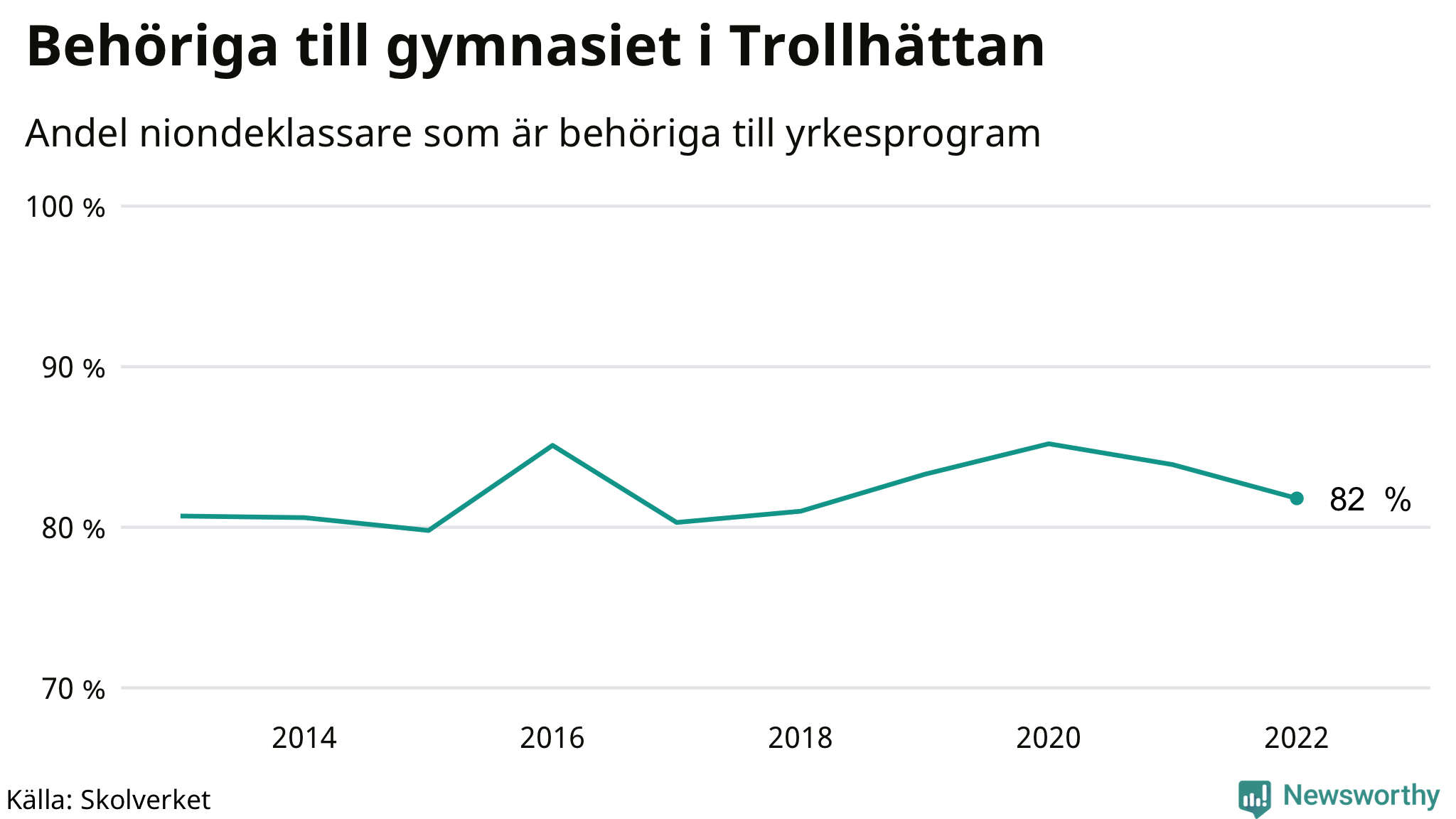 82 procent av eleverna som gick ut nian i Trollhättan i våras var behöriga till gymnasiets yrkesprogram. Det är en lägre andel än bland dem som gick ur nian våren 2021. Högst andel niondeklassare som var behöriga till gymnasiet i Västra Götalands län i våras fanns i Orusts kommun (91 procent). Lägst var andelen i Lilla Edets kommun (64 procent). I ytterligare två kommuner i länet var det bara en eller några få som inte klarade behörigheten.