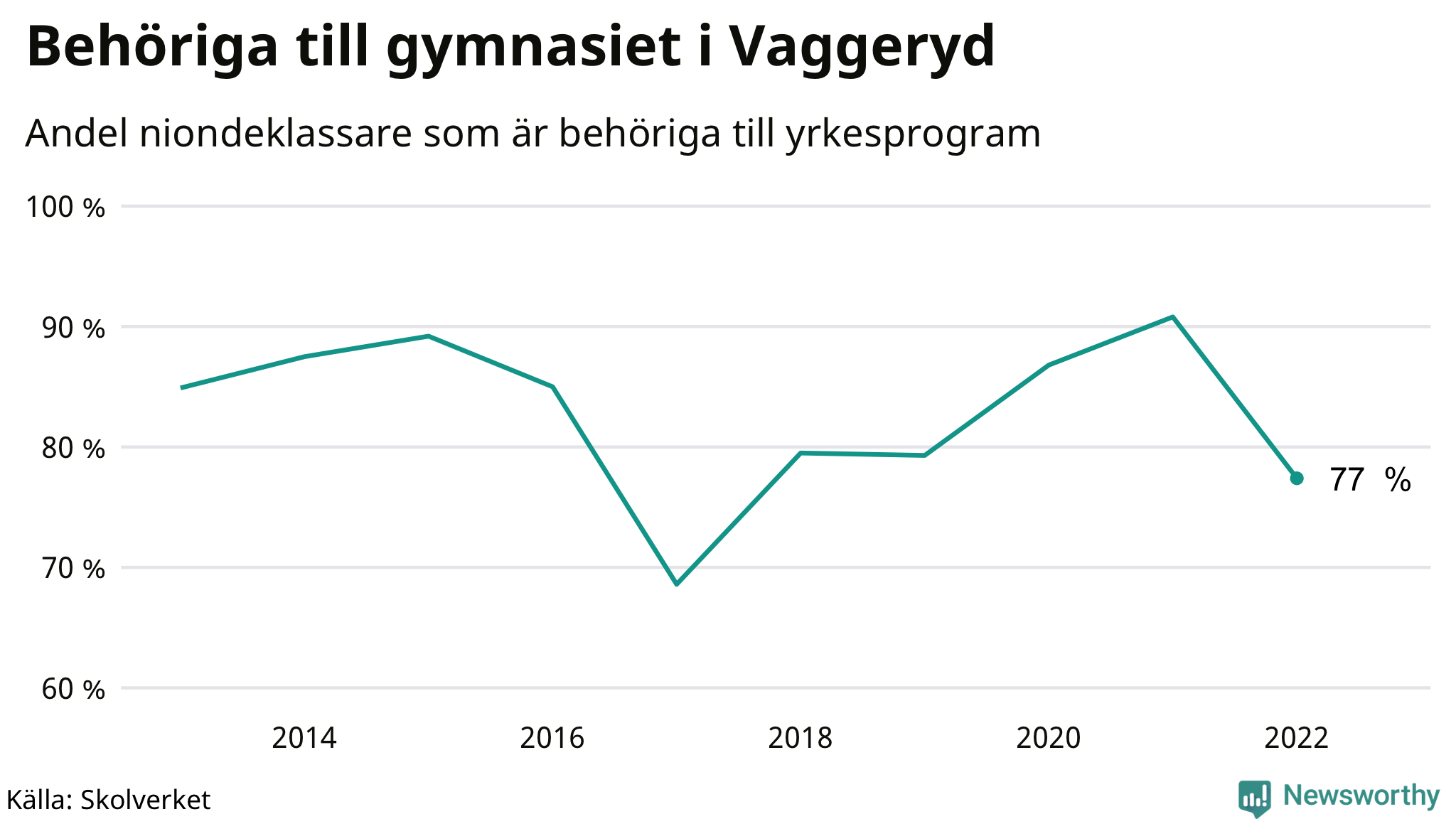 77 procent av eleverna som gick ut nian i Vaggeryd i våras var behöriga till gymnasiets yrkesprogram. Det är en lägre andel än bland dem som gick ur nian våren 2021. Det är den näst lägsta andelen i länet, före Mullsjö kommun.