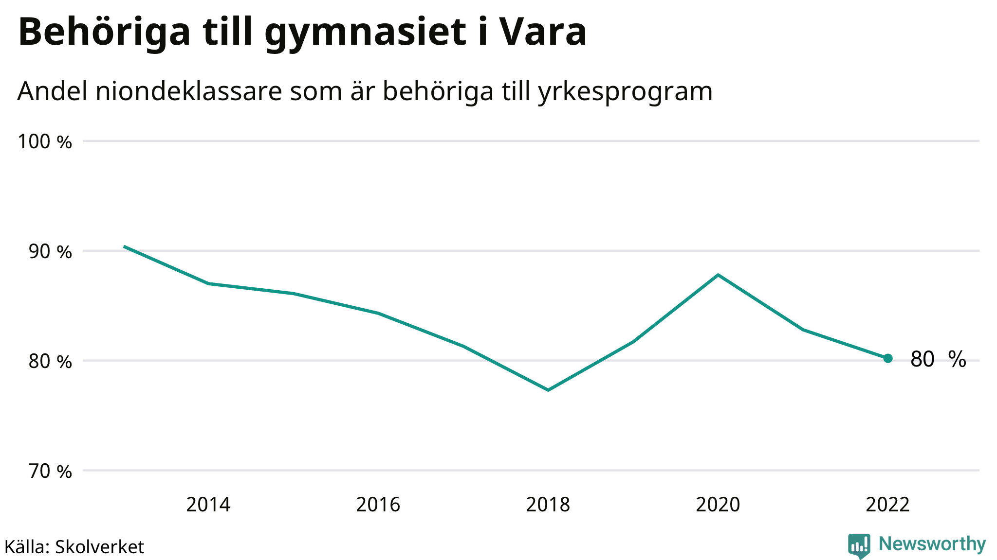 80 procent av eleverna som gick ut nian i Vara i våras var behöriga till gymnasiets yrkesprogram. Det är en lägre andel än bland dem som gick ur nian våren 2021. Högst andel niondeklassare som var behöriga till gymnasiet i Västra Götalands län i våras fanns i Orusts kommun (91 procent). Lägst var andelen i Lilla Edets kommun (64 procent). I ytterligare två kommuner i länet var det bara en eller några få som inte klarade behörigheten.