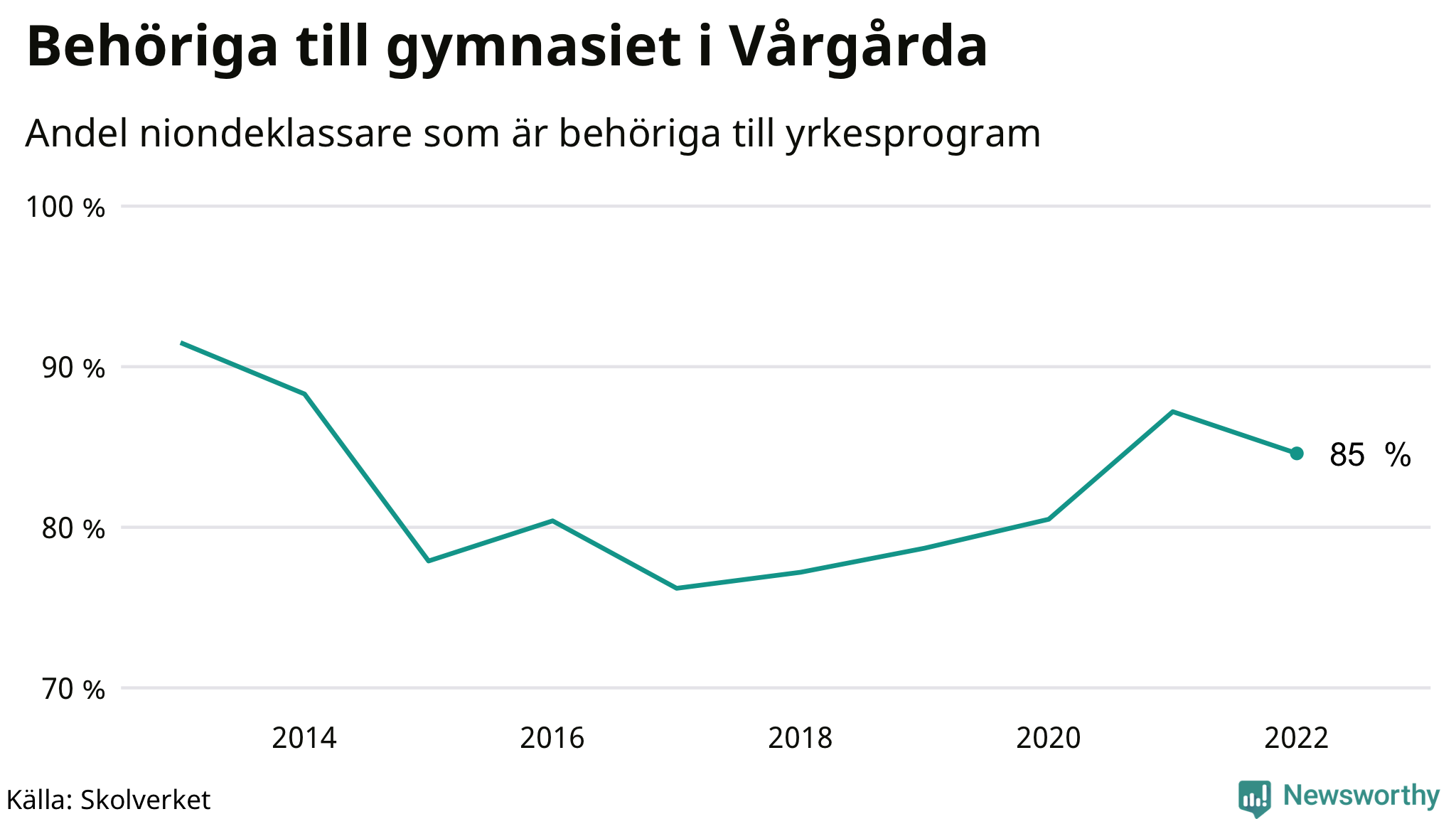 85 procent av eleverna som gick ut nian i Vårgårda i våras var behöriga till gymnasiets yrkesprogram. Det är en lägre andel än bland dem som gick ur nian våren 2021. Högst andel niondeklassare som var behöriga till gymnasiet i Västra Götalands län i våras fanns i Orusts kommun (91 procent). Lägst var andelen i Lilla Edets kommun (64 procent). I ytterligare två kommuner i länet var det bara en eller några få som inte klarade behörigheten.