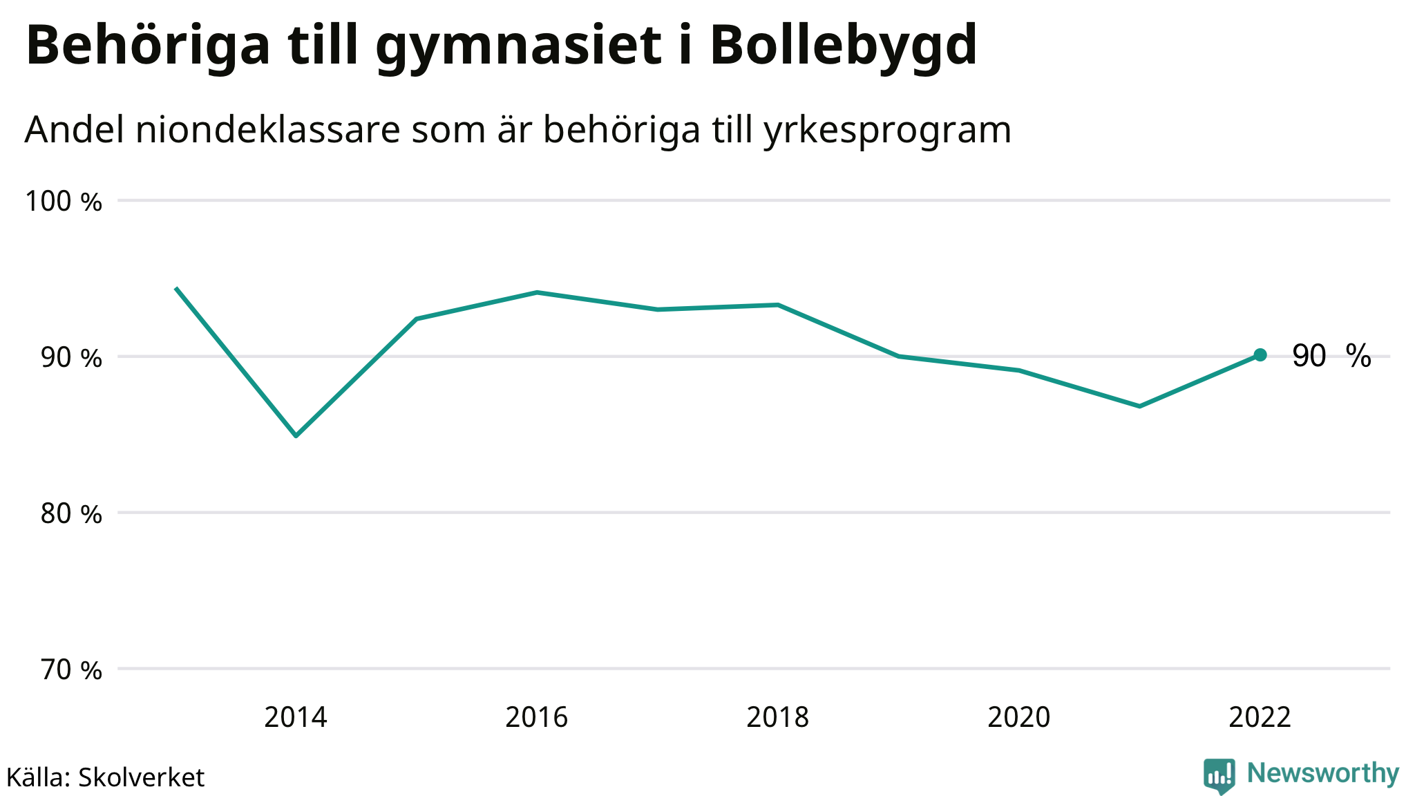 90 procent av eleverna som gick ut nian i Bollebygd i våras var behöriga till gymnasiets yrkesprogram. Det är en högre andel än bland dem som gick ur nian våren 2021. Högst andel niondeklassare som var behöriga till gymnasiet i Västra Götalands län i våras fanns i Orusts kommun (91 procent). Lägst var andelen i Lilla Edets kommun (64 procent). I ytterligare två kommuner i länet var det bara en eller några få som inte klarade behörigheten.