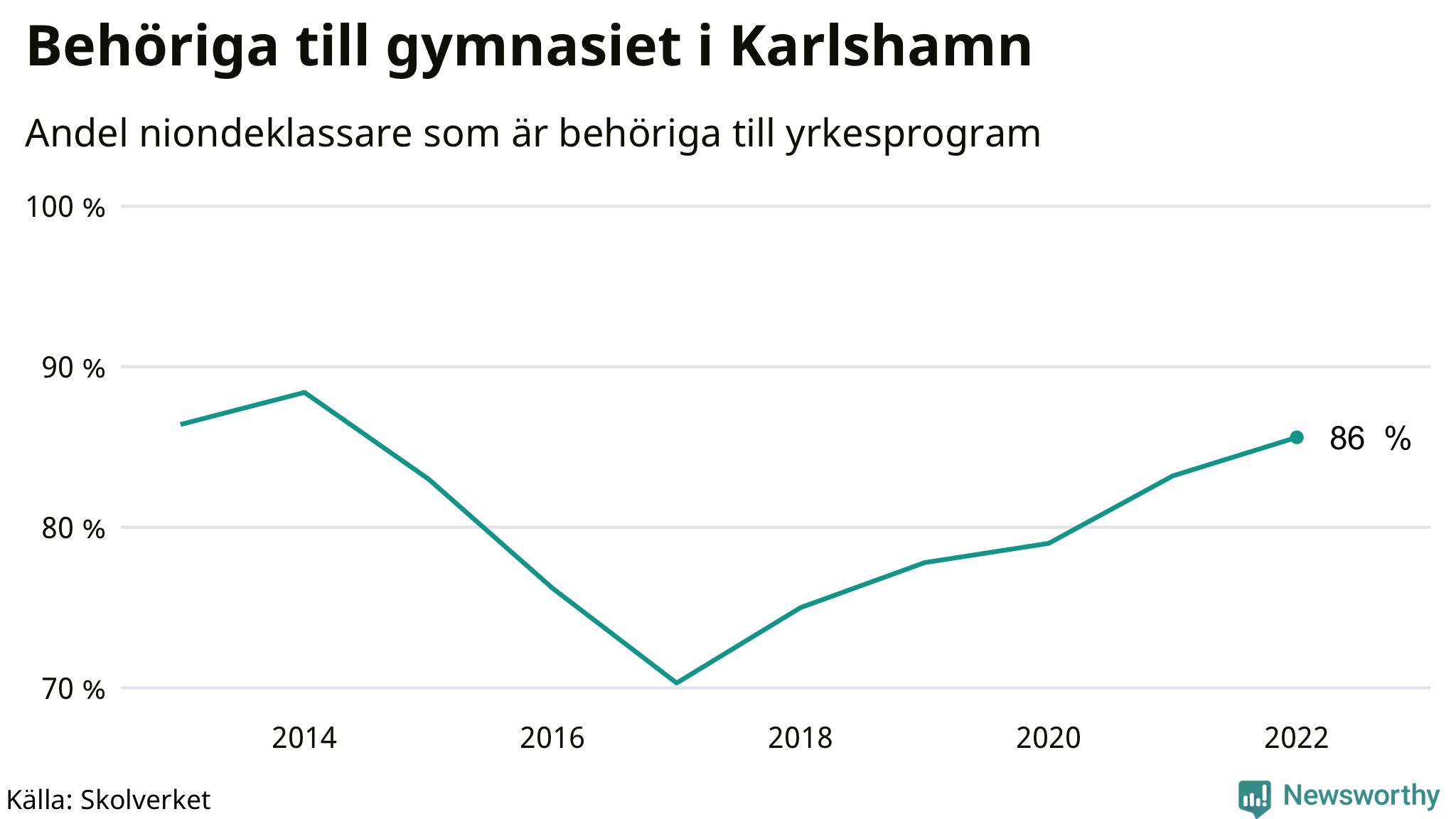 86 procent av eleverna som gick ut nian i Karlshamn i våras var behöriga till gymnasiets yrkesprogram. Det är en högre andel än bland dem som gick ur nian våren 2021. Det är den näst högsta andelen i länet, efter Karlskrona kommun.