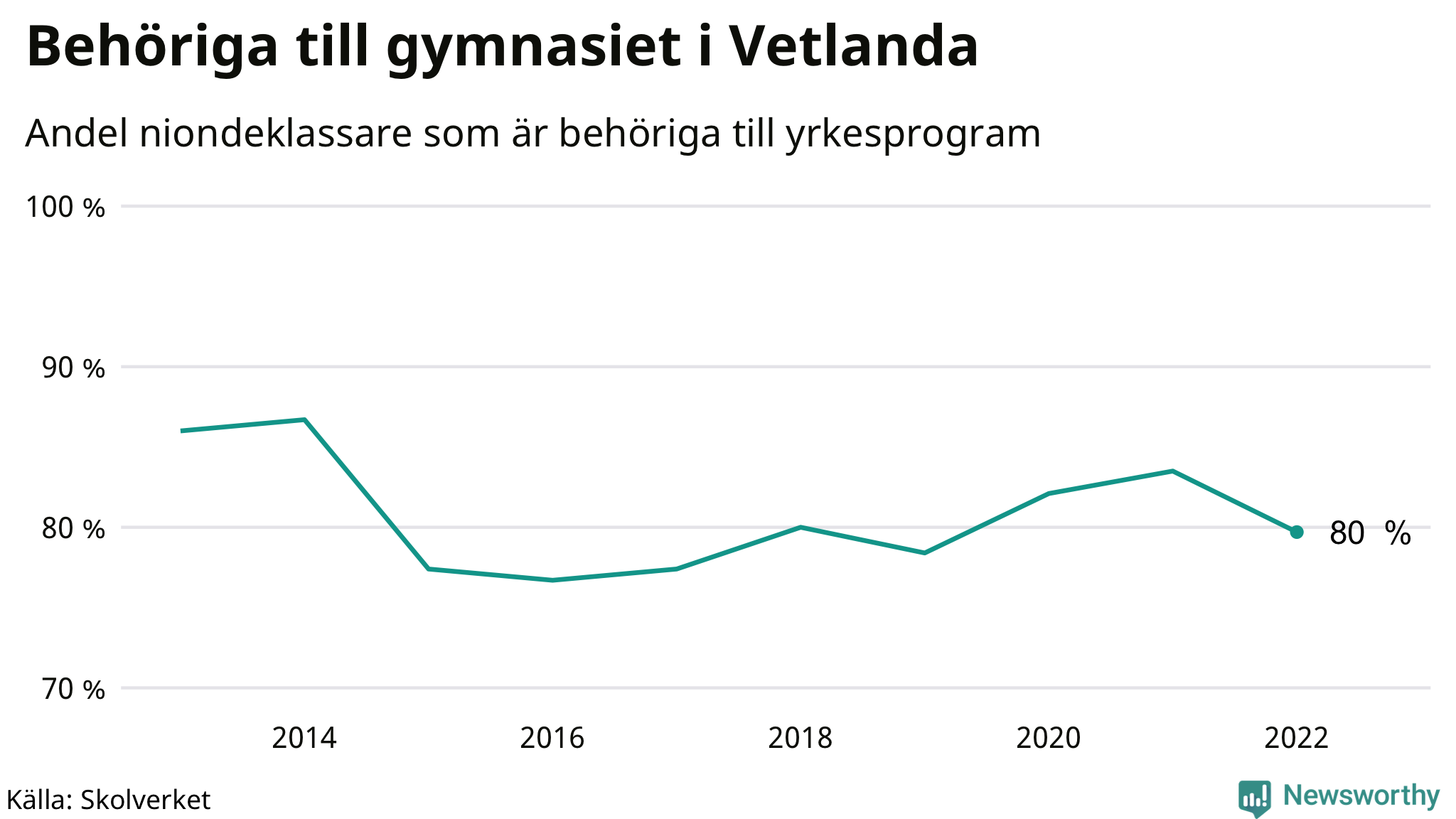 80 procent av eleverna som gick ut nian i Vetlanda i våras var behöriga till gymnasiets yrkesprogram. Det är en lägre andel än bland dem som gick ur nian våren 2021. Högst andel niondeklassare som var behöriga till gymnasiet i Jönköpings län i våras fanns i Habo kommun (90 procent). Lägst var andelen i Mullsjö kommun (75 procent).