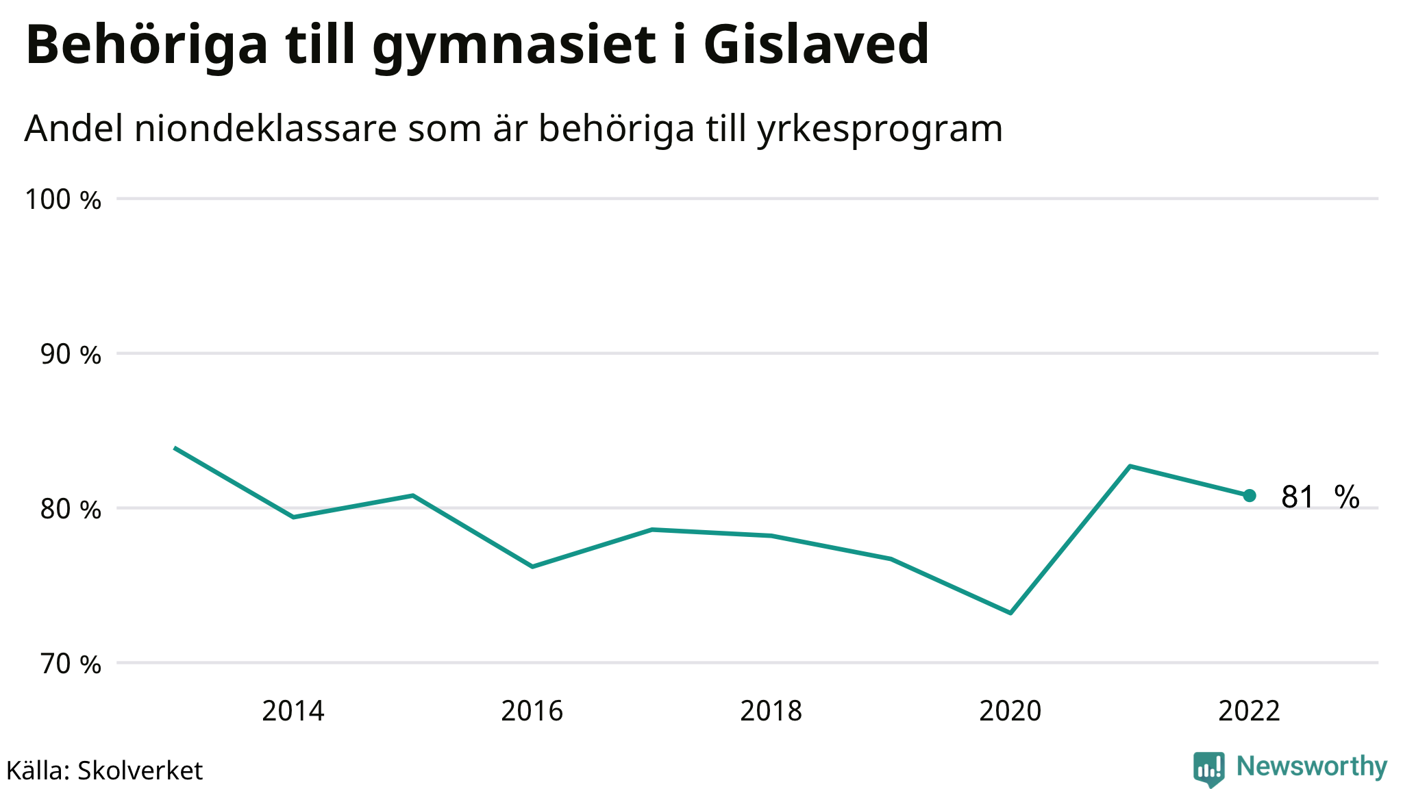 81 procent av eleverna som gick ut nian i Gislaved i våras var behöriga till gymnasiets yrkesprogram. Det är en lägre andel än bland dem som gick ur nian våren 2021. Högst andel niondeklassare som var behöriga till gymnasiet i Jönköpings län i våras fanns i Habo kommun (90 procent). Lägst var andelen i Mullsjö kommun (75 procent).