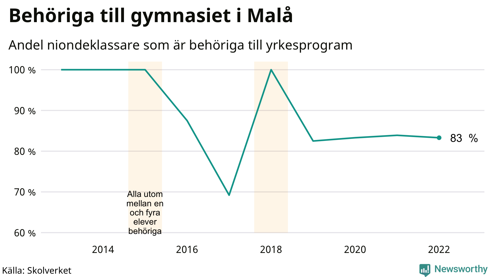 Av de niondeklassare som gick ut i Malå i våras var 83 procent behöriga till gymnasiets yrkesprogram. Det visar Skolverkets statistik som släpptes i dag.