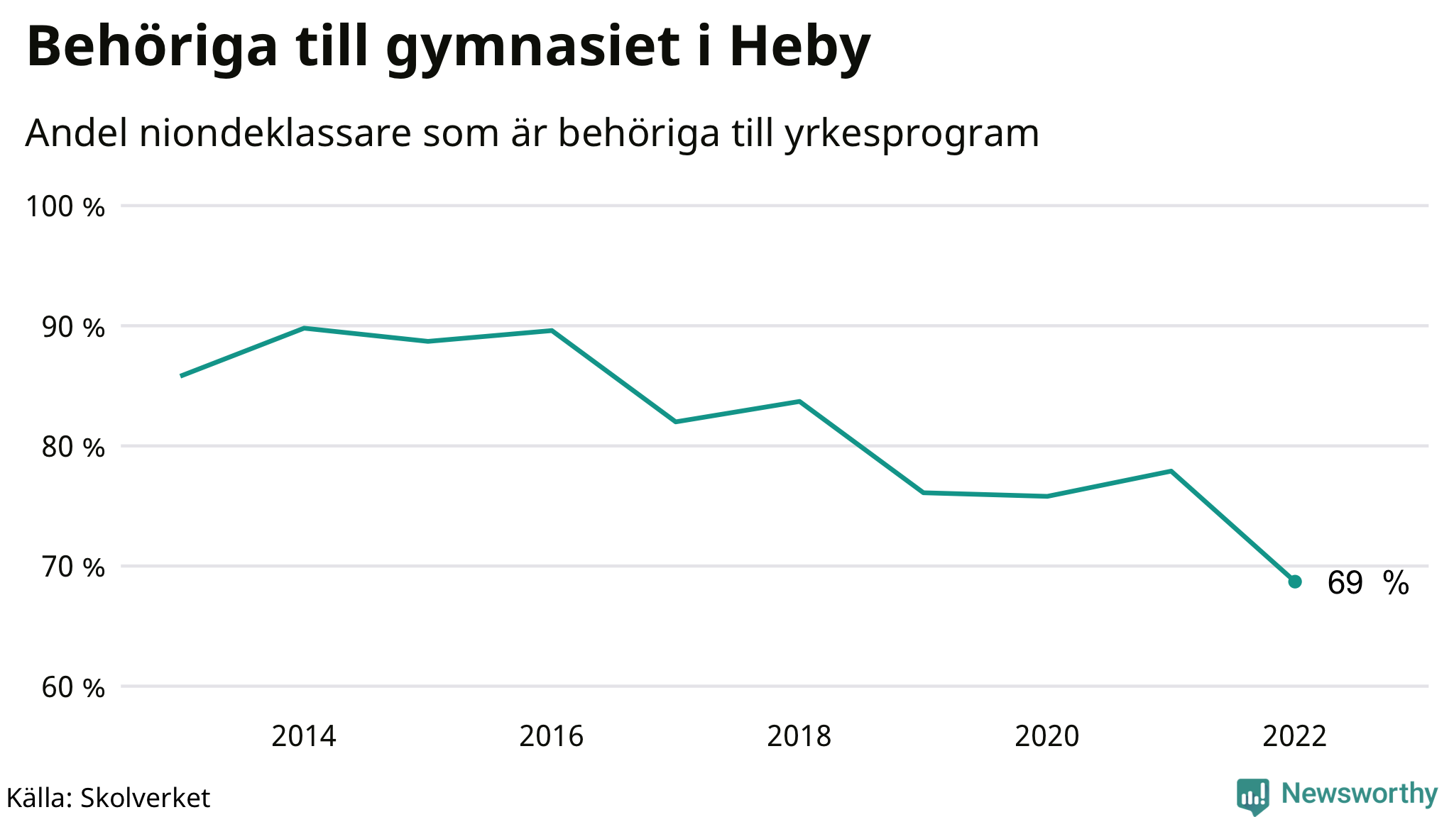 69 procent av eleverna som gick ut nian i Heby i våras var behöriga till gymnasiets yrkesprogram. Det är en lägre andel än bland dem som gick ur nian våren 2021. Det är den lägsta andelen i länet.För Heby innebär det den lägsta behörigheten som noterats i kommunen det senaste decenniet.