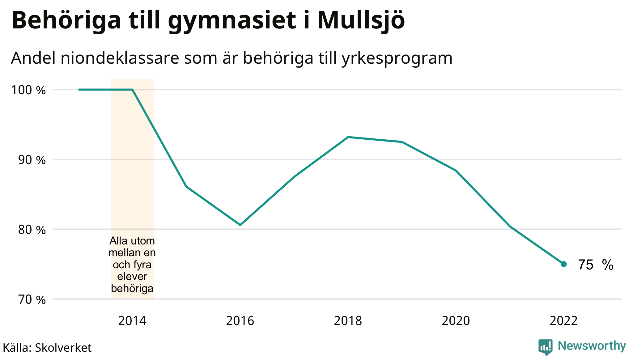 Av de niondeklassare som gick ut i Mullsjö i våras var 75 procent behöriga till gymnasiets yrkesprogram. Det är den lägsta andelen i kommunen under det senaste decenniet, visar Skolverkets statistik som släpptes i dag.