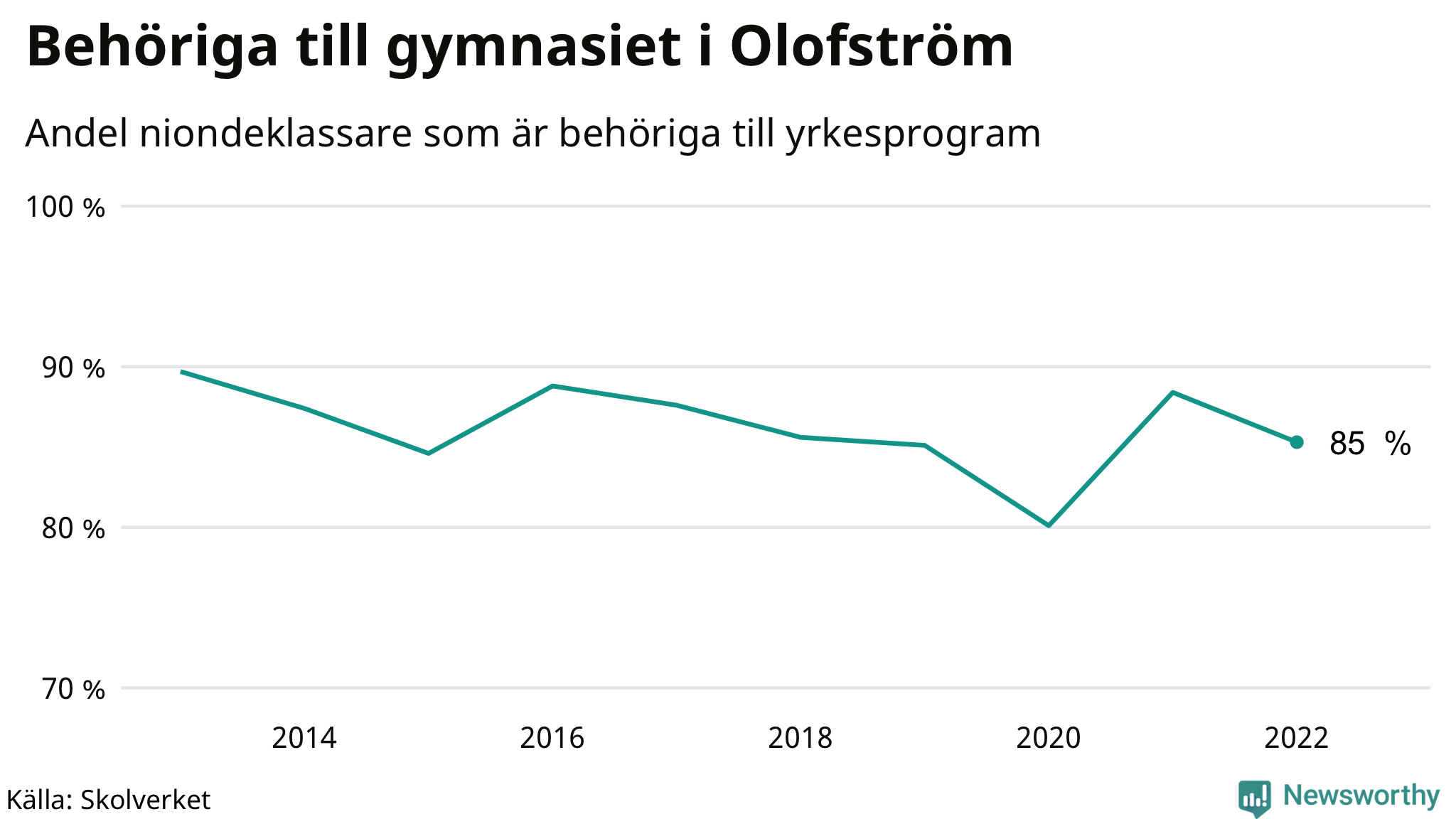 85 procent av eleverna som gick ut nian i Olofström i våras var behöriga till gymnasiets yrkesprogram. Det är en lägre andel än bland dem som gick ur nian våren 2021. Högst andel niondeklassare som var behöriga till gymnasiet i Blekinge län i våras fanns i Karlskrona kommun (86 procent). Lägst var andelen i Ronneby kommun (76 procent).