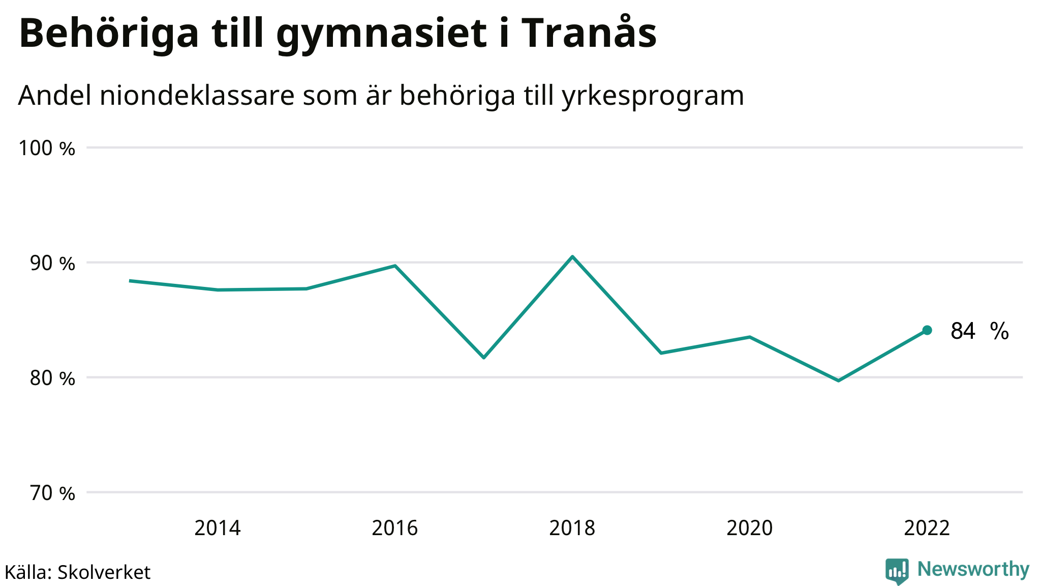 84 procent av eleverna som gick ut nian i Tranås i våras var behöriga till gymnasiets yrkesprogram. Det är en högre andel än bland dem som gick ur nian våren 2021. Högst andel niondeklassare som var behöriga till gymnasiet i Jönköpings län i våras fanns i Habo kommun (90 procent). Lägst var andelen i Mullsjö kommun (75 procent).