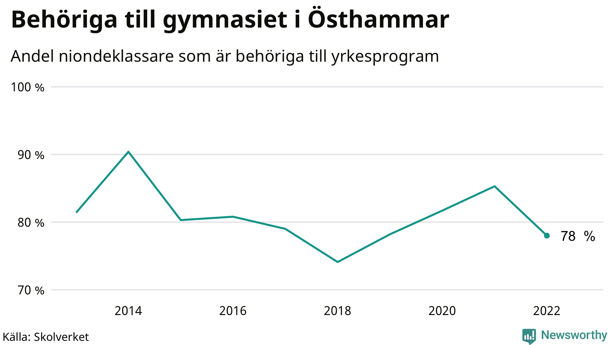 78 procent av eleverna som gick ut nian i Östhammar i våras var behöriga till gymnasiets yrkesprogram. Det är en lägre andel än bland dem som gick ur nian våren 2021. Högst andel niondeklassare som var behöriga till gymnasiet i Uppsala län i våras fanns i Håbo kommun (89 procent). Lägst var andelen i Heby kommun (69 procent).