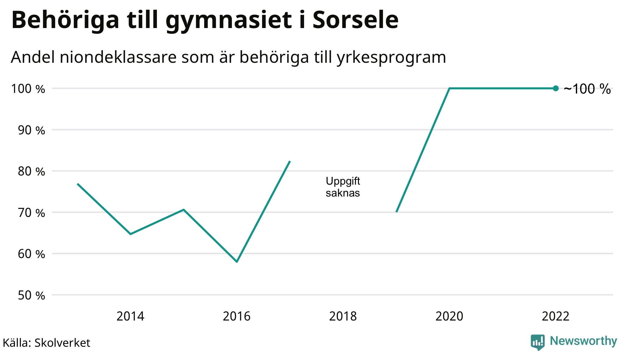 Nästan alla elever som gick ut nian i Sorsele i våras var behöriga till gymnasiets yrkesprogram, precis som året innan. Någonstans mellan 14 och 17 av de 18 eleverna som slutade nian i våras klarade behörigheten, och Sorsele tillhör de elva kommuner där färre än fem elever inte blev behöriga till yrkesgymnasiet.Sorsele tillhör de elva kommuner i landet där färre än fem elever inte nådde behörighet.