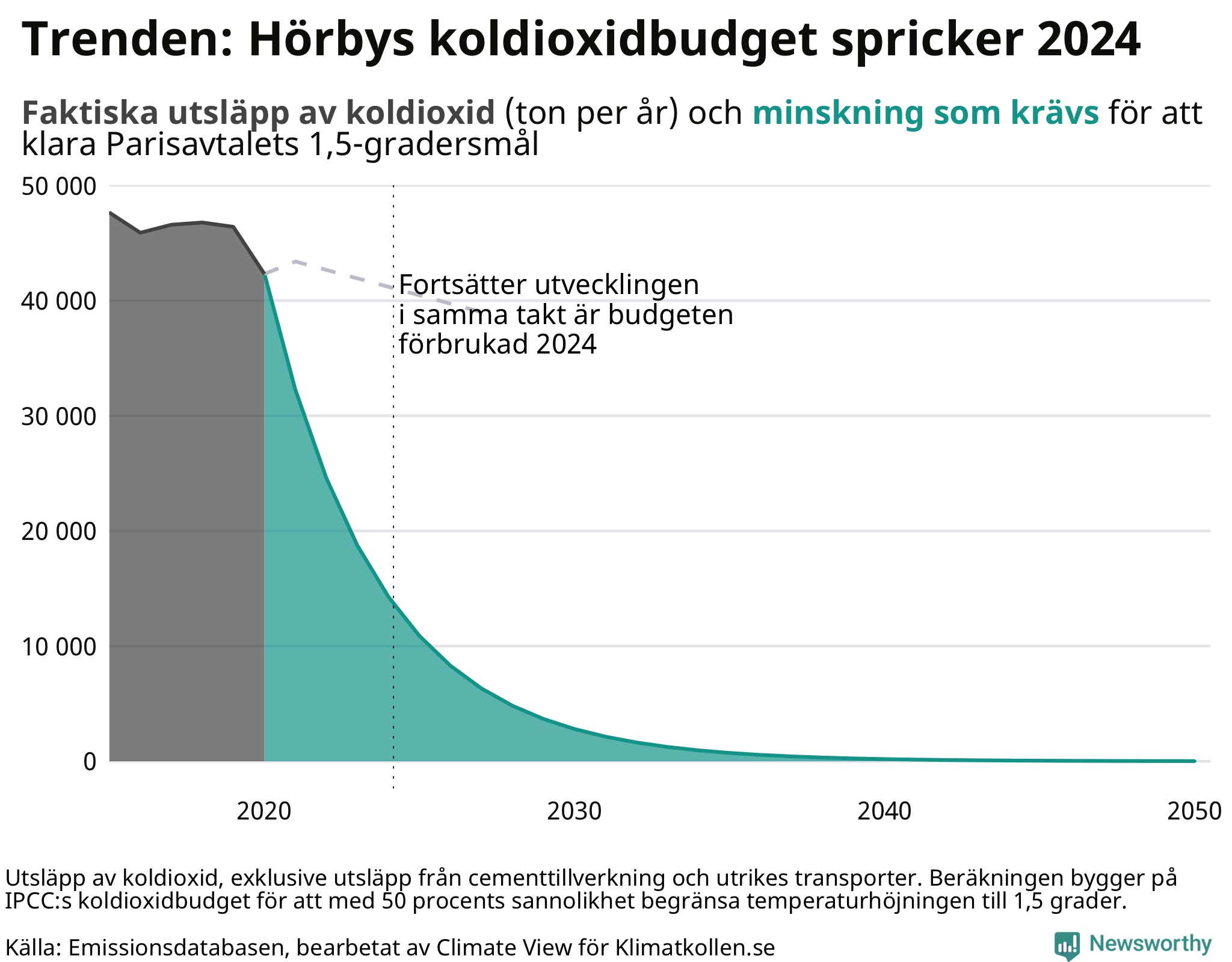 Utsläppen i Hörby har minskat de senaste fem åren – enligt Klimatkollens beräkningar behöver de nu minska med 24 procent årligen. I Skåne län är det bara Malmö kommun som ser ut att klara sin del av budgeten med nuvarande minskningstakt.Kommun CO2-utsläpp 2020 Procentuell minskning för att klara CO2-budgeten Kan klara budgeten i nuvarande tempo Bjuv 47 690 21 % 🔴 Bromölla 65 476 21 % 🔴 Burlöv 58 257 20 % 🔴 Båstad 40 710 23 % 🔴 Eslöv 211 815 30 % 🔴 Helsingborg 432 499 25 % 🔴 Hässleholm 196 353 28 % 🔴 Höganäs 202 511 23 % 🔴 Hörby 42 312 24 % 🔴 Höör 43 551 23 % 🔴 Klippan 66 697 24 % 🔴 Kristianstad 201 151 23 % 🔴 Kävlinge 65 547 23 % 🔴 Landskrona 199 747 25 % 🔴 Lomma 69 016 23 % 🔴 Lund 146 716 22 % 🔴 Malmö 664 389 19 % 🟢 Osby 32 456 24 % 🔴 Perstorp 51 316 26 % 🔴 Simrishamn 42 436 23 % 🔴 Sjöbo 43 397 23 % 🔴 Skurup 31 381 24 % 🔴 Staffanstorp 59 864 23 % 🔴 Svalöv 34 028 22 % 🔴 Svedala 69 203 23 % 🔴 Tomelilla 37 840 23 % 🔴 Trelleborg 70 845 22 % 🔴 Vellinge 59 158 24 % 🔴 Ystad 63 811 22 % 🔴 Åstorp 45 499 22 % 🔴 Ängelholm 124 985 21 % 🔴 Örkelljunga 58 185 24 % 🔴 Östra Göinge 30 460 23 % 🔴