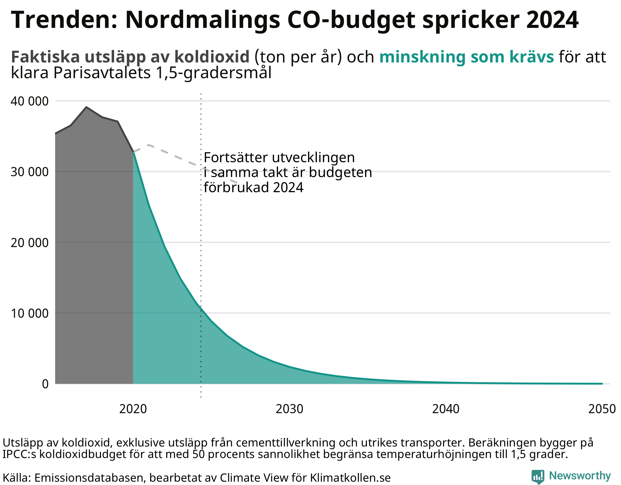 Utsläppen i Nordmaling har minskat de senaste fem åren – enligt Klimatkollens beräkningar behöver de nu minska med 23 procent årligen. I Västerbottens län är det ingen kommun som ser ut att klara sin del av budgeten med nuvarande minskningstakt.Kommun CO2-utsläpp 2020 Procentuell minskning för att klara CO2-budgeten Kan klara budgeten i nuvarande tempo Bjurholm 10 829 23 % 🔴 Dorotea 11 055 25 % 🔴 Lycksele 49 001 20 % 🔴 Malå 9 714 24 % 🔴 Nordmaling 32 773 23 % 🔴 Norsjö 15 036 21 % 🔴 Robertsfors 35 432 22 % 🔴 Skellefteå 472 541 24 % 🔴 Sorsele 14 394 25 % 🔴 Storuman 27 551 23 % 🔴 Umeå 283 126 22 % 🔴 Vilhelmina 26 938 24 % 🔴 Vindeln 25 880 23 % 🔴 Vännäs 17 069 23 % 🔴 Åsele 21 533 25 % 🔴