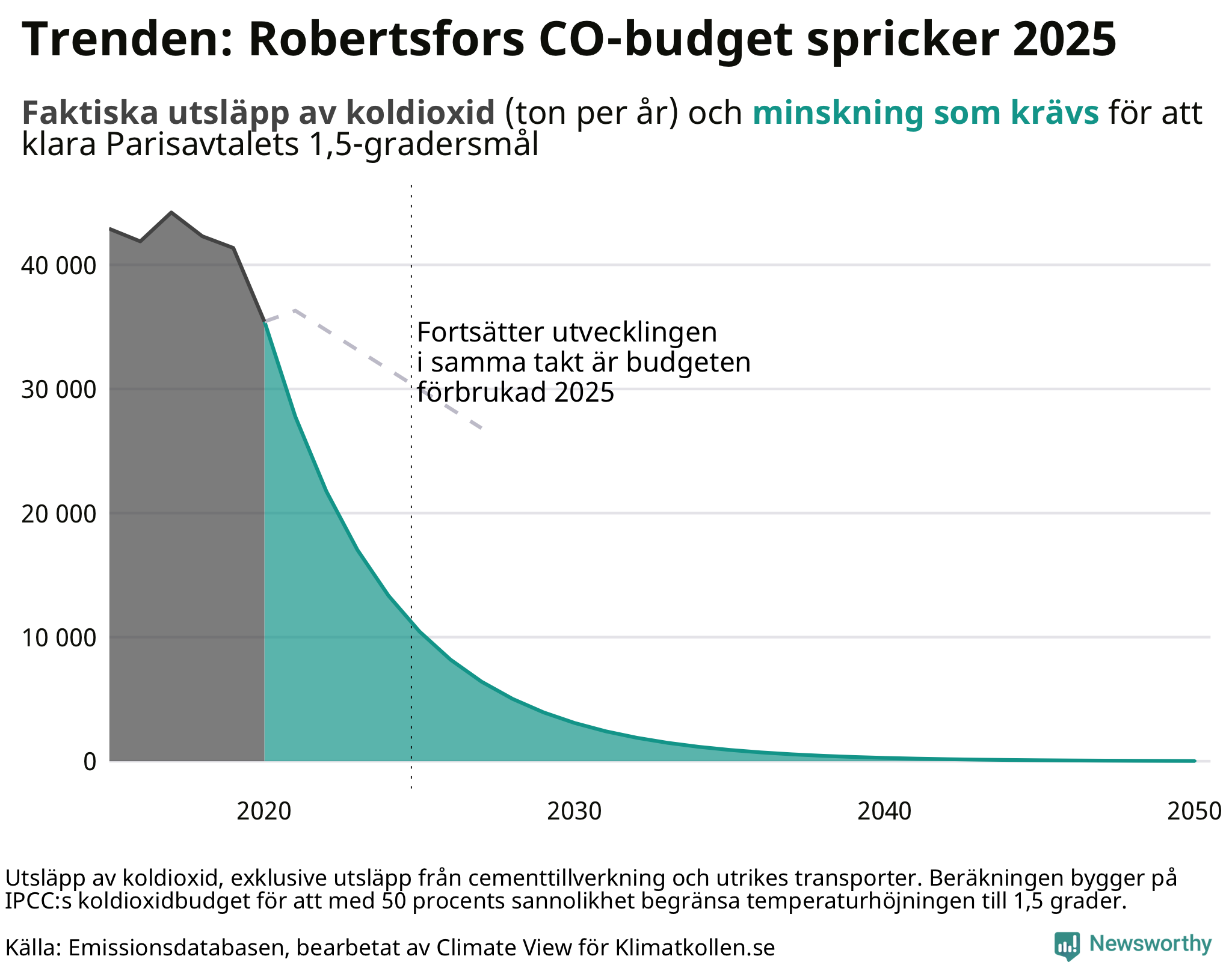 Utsläppen i Robertsfors har minskat de senaste fem åren – enligt Klimatkollens beräkningar behöver de nu minska med 22 procent årligen. I Västerbottens län är det ingen kommun som ser ut att klara sin del av budgeten med nuvarande minskningstakt.Kommun CO2-utsläpp 2020 Procentuell minskning för att klara CO2-budgeten Kan klara budgeten i nuvarande tempo Bjurholm 10 829 23 % 🔴 Dorotea 11 055 25 % 🔴 Lycksele 49 001 20 % 🔴 Malå 9 714 24 % 🔴 Nordmaling 32 773 23 % 🔴 Norsjö 15 036 21 % 🔴 Robertsfors 35 432 22 % 🔴 Skellefteå 472 541 24 % 🔴 Sorsele 14 394 25 % 🔴 Storuman 27 551 23 % 🔴 Umeå 283 126 22 % 🔴 Vilhelmina 26 938 24 % 🔴 Vindeln 25 880 23 % 🔴 Vännäs 17 069 23 % 🔴 Åsele 21 533 25 % 🔴