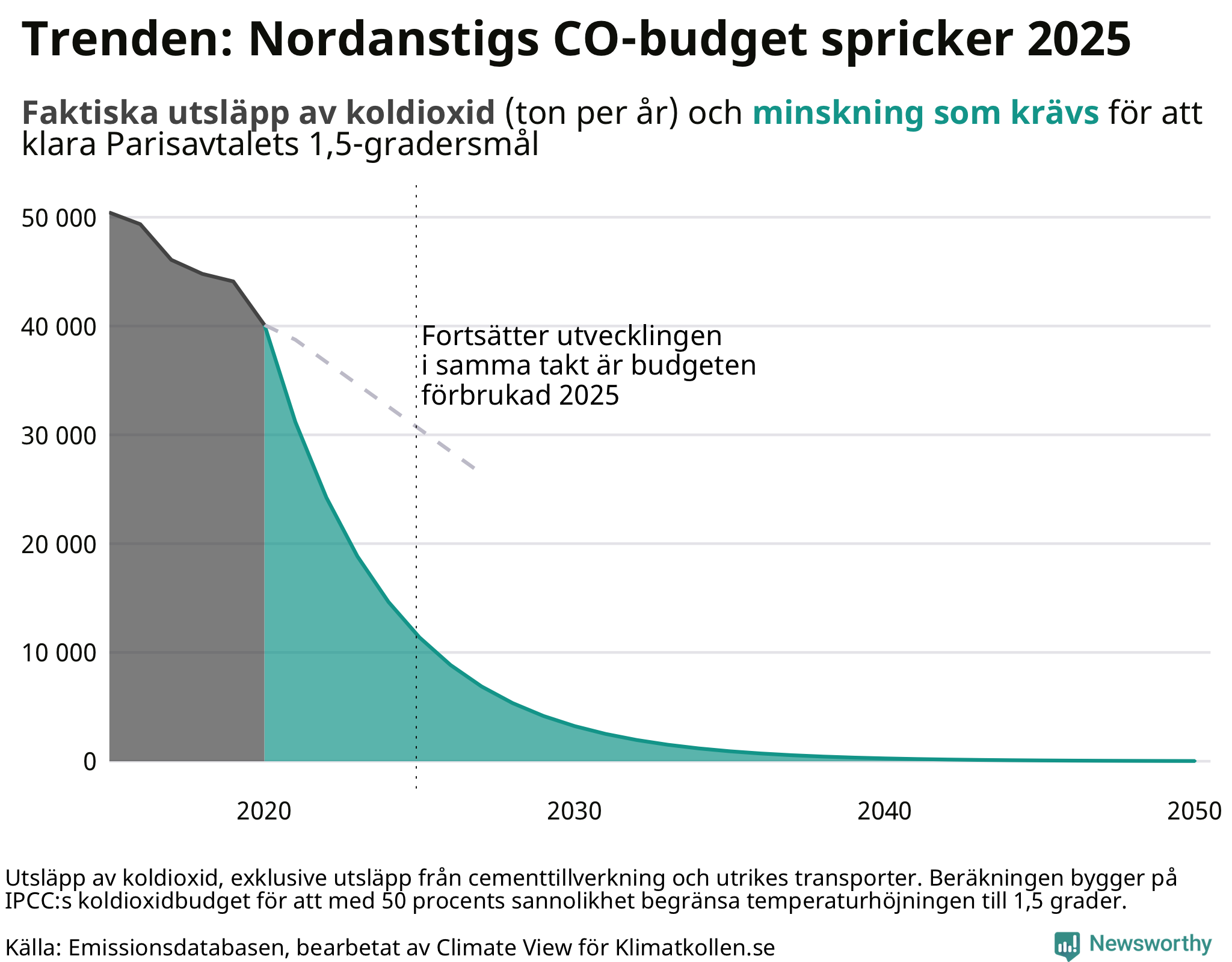 Utsläppen i Nordanstig har minskat de senaste fem åren – enligt Klimatkollens beräkningar behöver de nu minska med 22 procent årligen. I Gävleborgs län är det ingen kommun som ser ut att klara sin del av budgeten med nuvarande minskningstakt.Kommun CO2-utsläpp 2020 Procentuell minskning för att klara CO2-budgeten Kan klara budgeten i nuvarande tempo Bollnäs 80 812 24 % 🔴 Gävle 225 331 22 % 🔴 Hofors 75 294 18 % 🔴 Hudiksvall 117 440 22 % 🔴 Ljusdal 68 920 23 % 🔴 Nordanstig 40 101 22 % 🔴 Ockelbo 14 839 20 % 🔴 Ovanåker 28 345 22 % 🔴 Sandviken 187 455 22 % 🔴 Söderhamn 101 445 21 % 🔴
