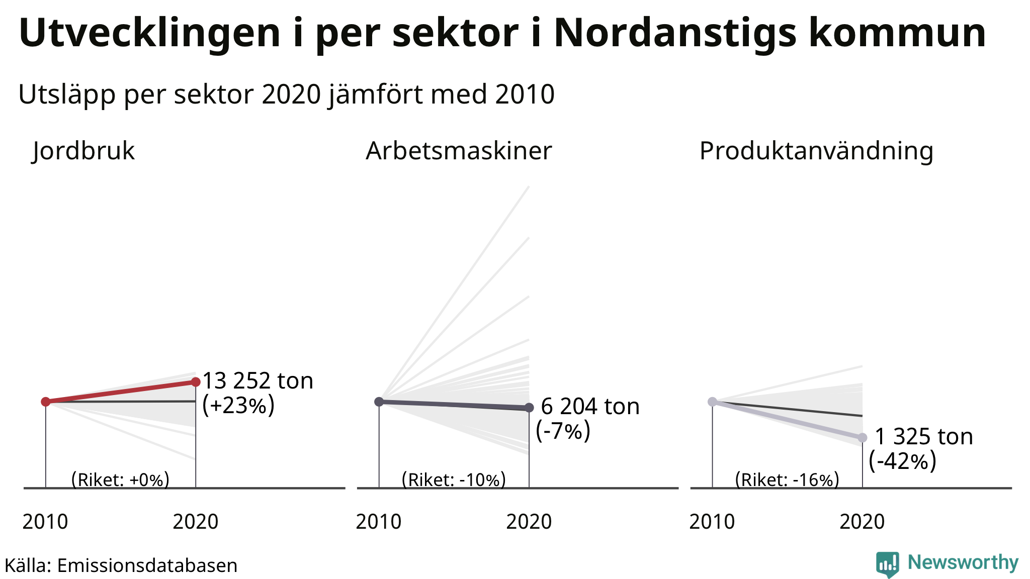 Efter transporter står jordbruket för störst territoriella utsläpp av växthustgaser i Nordanstig, 13 252 ton, eller 23 procent av utsläppen. Det är också en sektor där utsläppen legat relativt still i Sverige de senaste tio åren, medan de ökat något i Nordanstig.