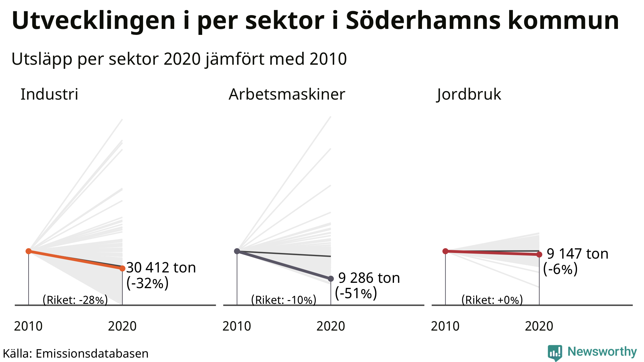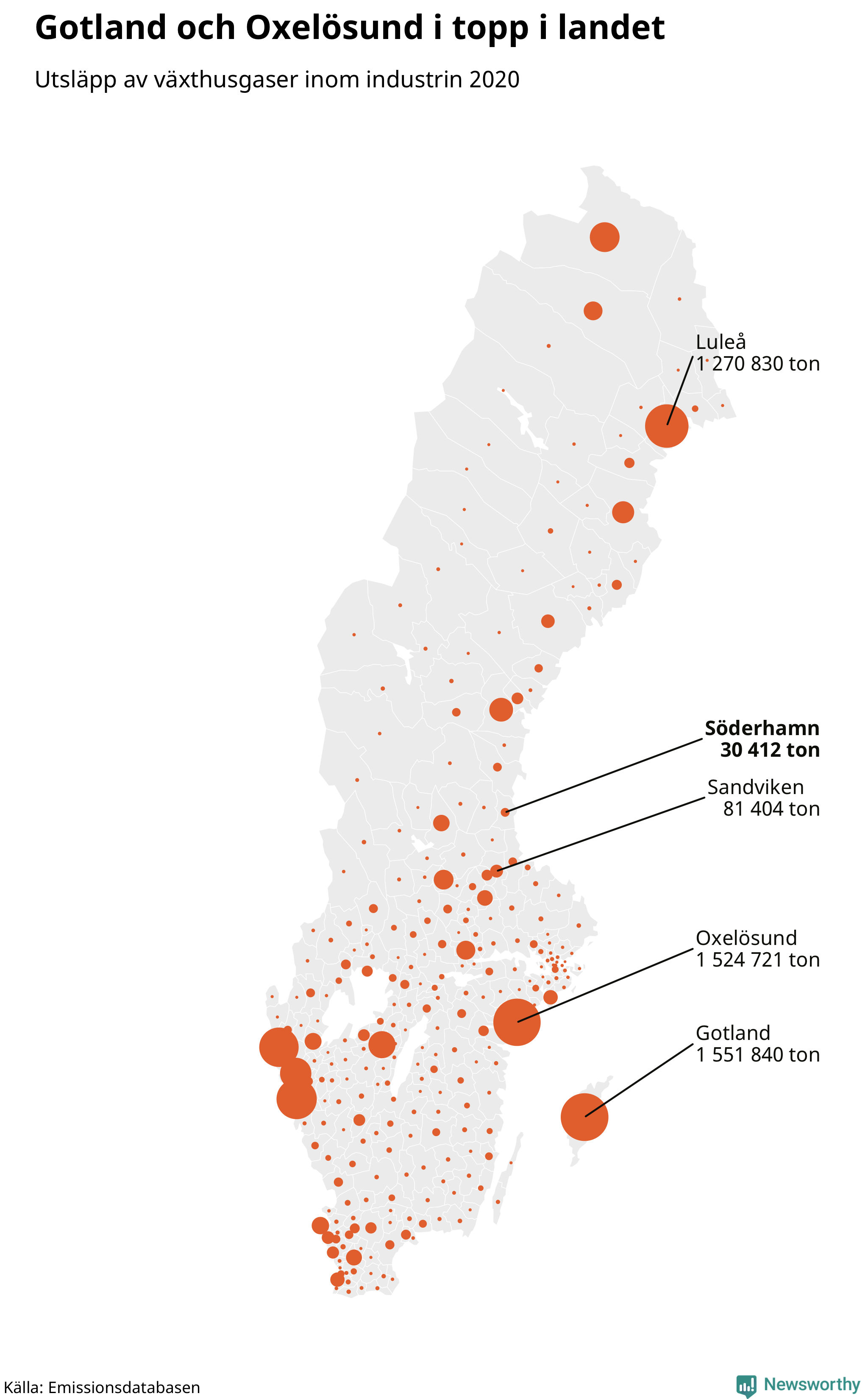 Precis som inrikes transporter står industrin för ungefär en tredjedel av Sveriges territoriella utsläpp. Men de utsläppen är betydligt mer ojämnt spridda över landet. 70 procent av utsläppen av växthusgaser från industri släpps ut i tio kommuner och i riket har utsläppen minskat med 28 procent sedan 2010. Söderhamn tillhör inte kommunerna med störst utsläpp, enligt SMHI:s siffror stod industrin i kommunen för 30 412 ton, eller 25 procent av utsläppen, 2020. Utsläppen har minskat med 32 procent jämfört med 2010.Mest industriutsläpp i Gävleborgs län skedde i Sandvikens kommun under 2020, som tillhör den tredjedel av kommuner i landet som har största industriutsläpp.