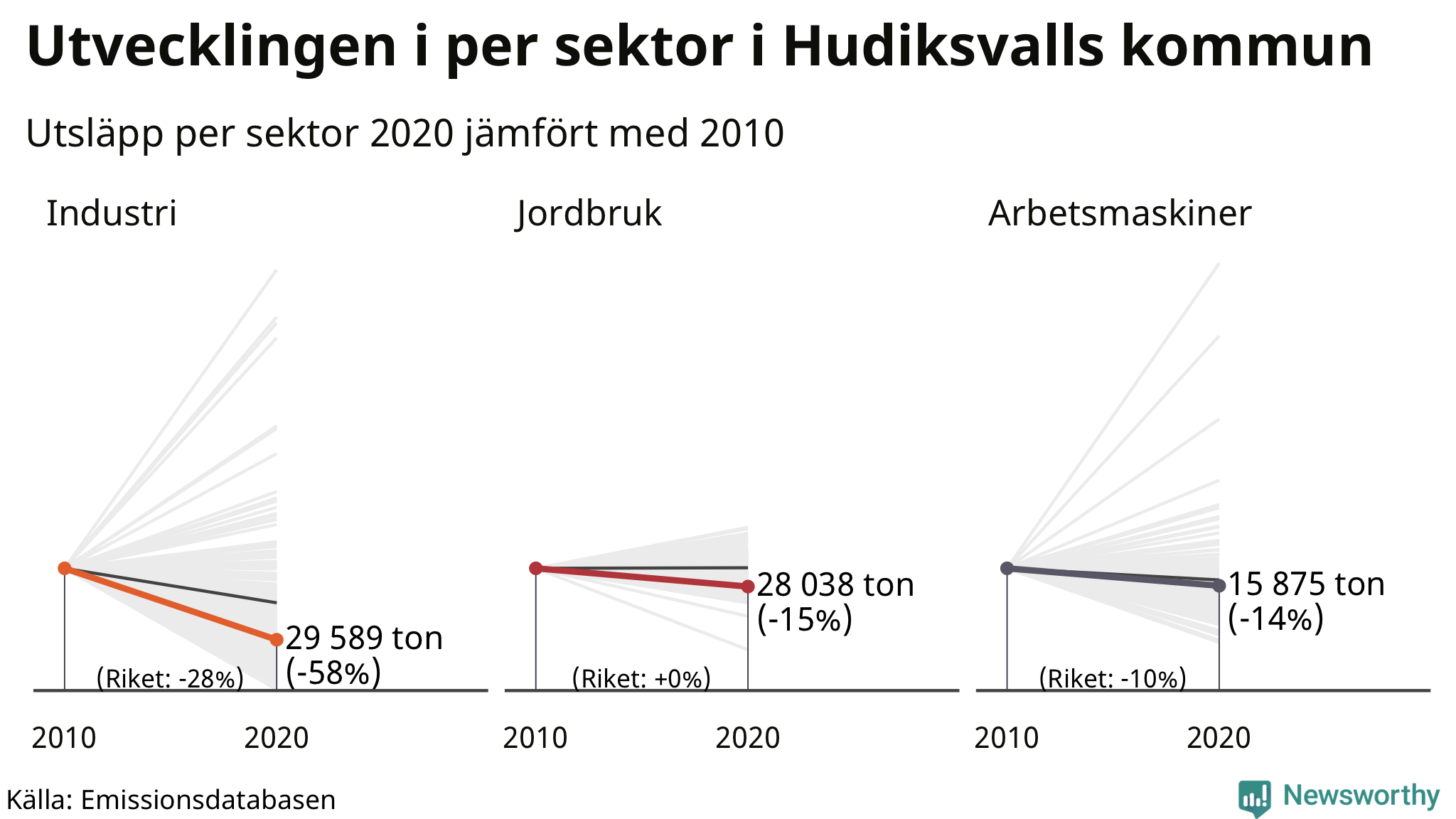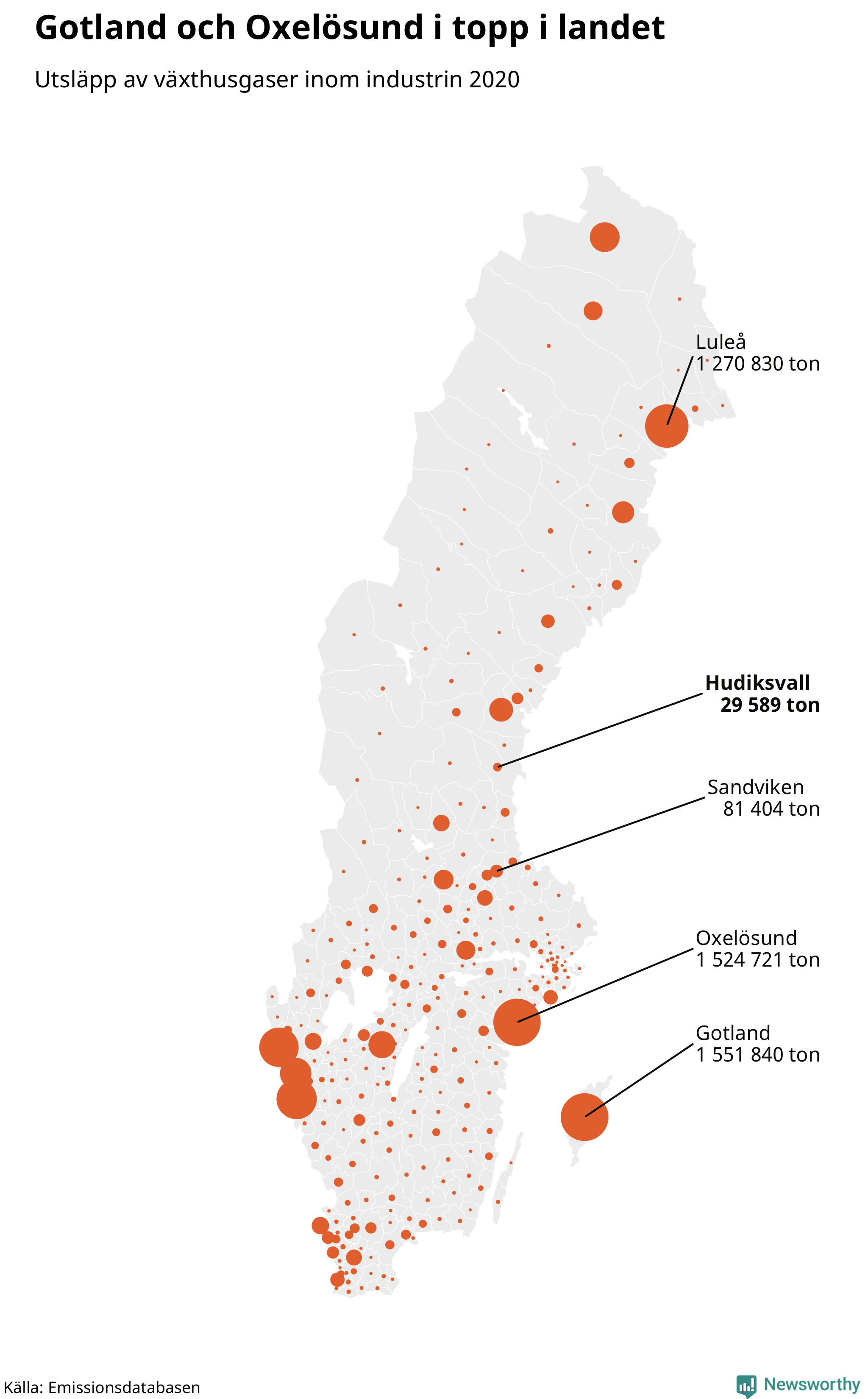 Precis som inrikes transporter står industrin för ungefär en tredjedel av Sveriges territoriella utsläpp. Men de utsläppen är betydligt mer ojämnt spridda över landet. 70 procent av utsläppen av växthusgaser från industri släpps ut i tio kommuner och i riket har utsläppen minskat med 28 procent sedan 2010. Hudiksvall tillhör inte kommunerna med störst utsläpp, enligt SMHI:s siffror stod industrin i kommunen för 29 589 ton, eller 18 procent av utsläppen, 2020. Utsläppen har minskat med 58 procent jämfört med 2010.Mest industriutsläpp i Gävleborgs län skedde i Sandvikens kommun under 2020, som tillhör den tredjedel av kommuner i landet som har största industriutsläpp.