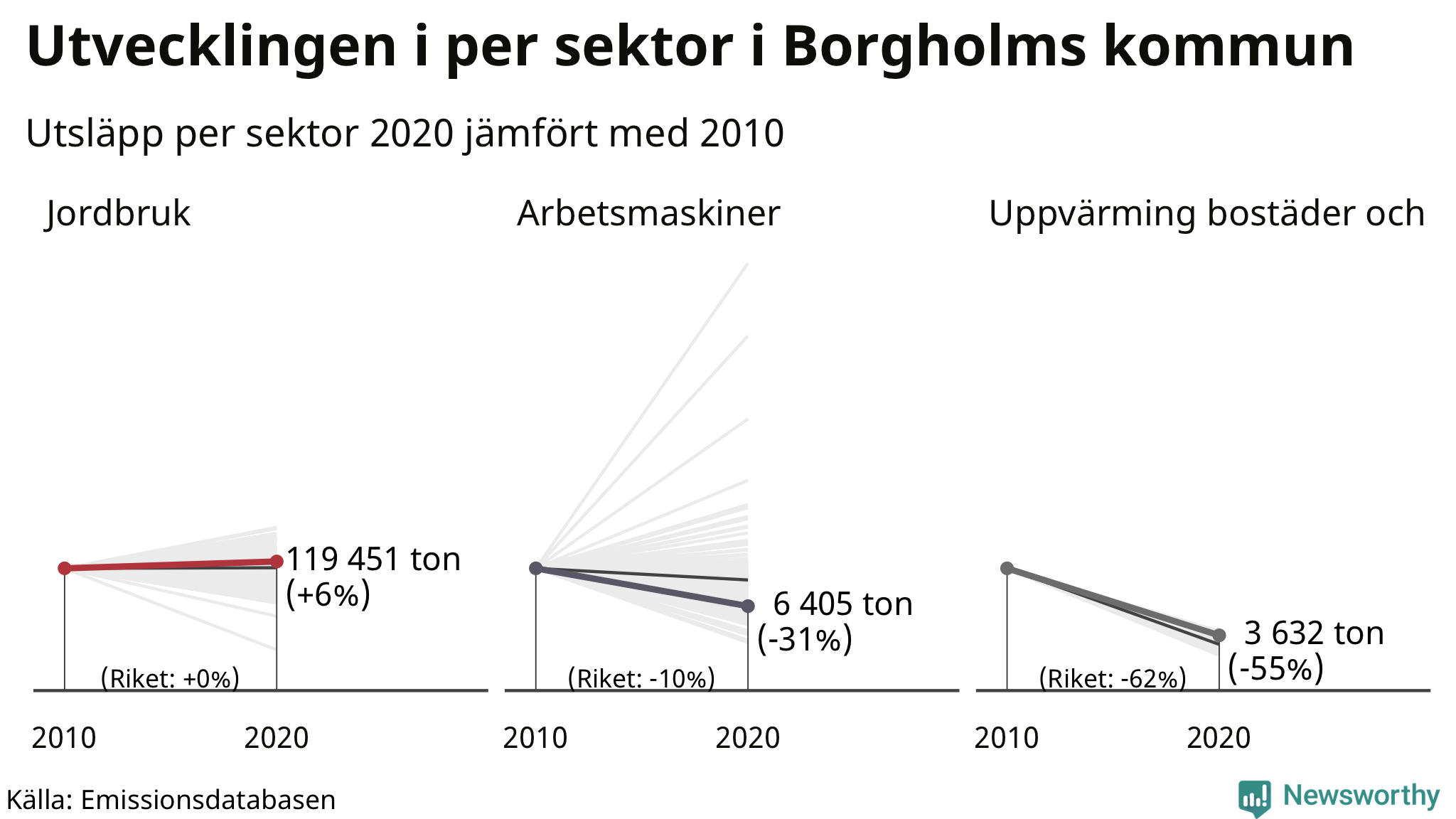 Räknar man alla växthusgaser som släpptes ut i Borgholm 2020 står jordbrukssektorn för 119 451 ton, vilket motsvarar 70 procent av de territoriella utsläppen i kommunen. Det är också en sektor där utsläppen legat relativt still i Sverige de senaste tio åren, medan de ökat något i Borgholm.