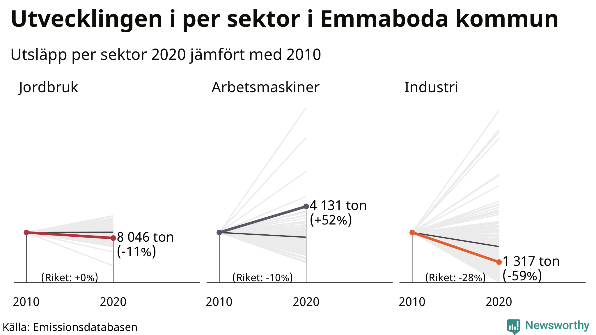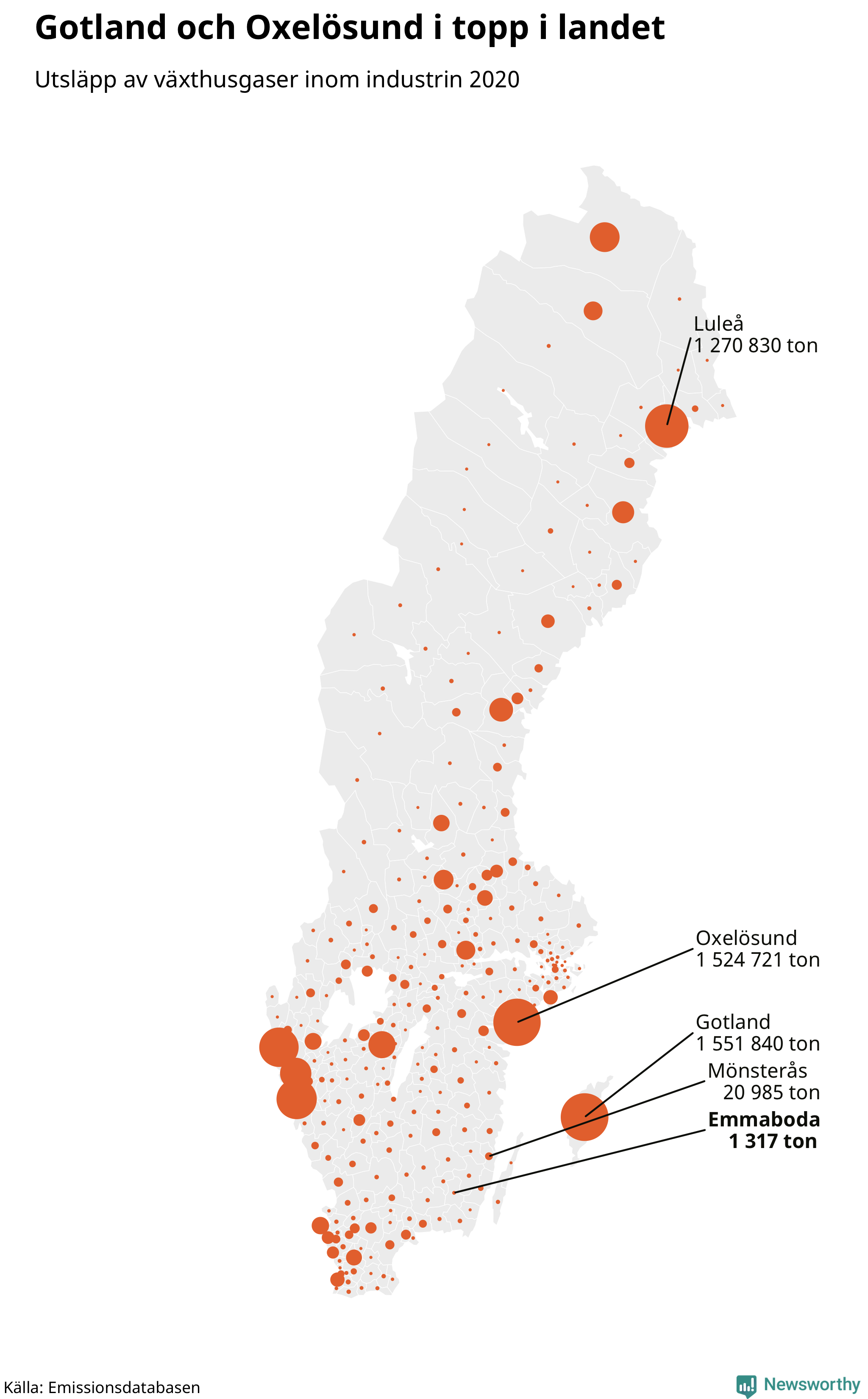 Precis som inrikes transporter står industrin för ungefär en tredjedel av Sveriges territoriella utsläpp. Men de utsläppen är betydligt mer ojämnt spridda över landet. 70 procent av utsläppen av växthusgaser från industri släpps ut i tio kommuner och i riket har utsläppen minskat med 28 procent sedan 2010. Industrin står för 1 317 ton i Emmaboda kommun, vilket är en relativt liten del av utsläppen, 4 procent. Utsläppen har minskat med 59 procent jämfört med 2010.Mest industriutsläpp i Kalmar län skedde i Mönsterås kommun under 2020, som tillhör den tredjedel av kommuner i landet som har största industriutsläpp.