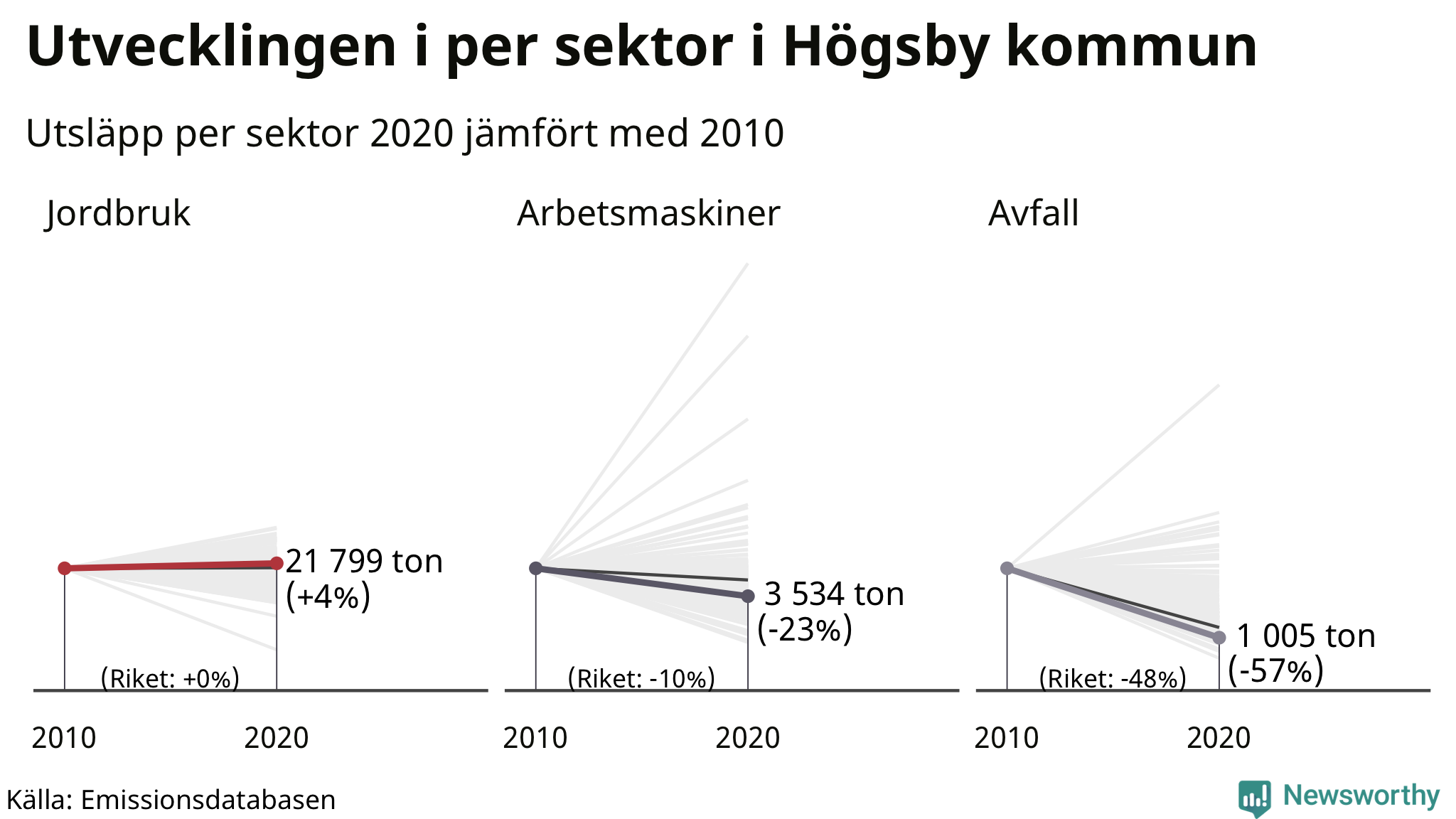 Räknar man alla växthusgaser som släpptes ut i Högsby 2020 står jordbrukssektorn för 21 799 ton, vilket motsvarar 53 procent av de territoriella utsläppen i kommunen. Det är också en sektor där utsläppen legat relativt still i Sverige de senaste tio åren, medan de ökat något i Högsby.