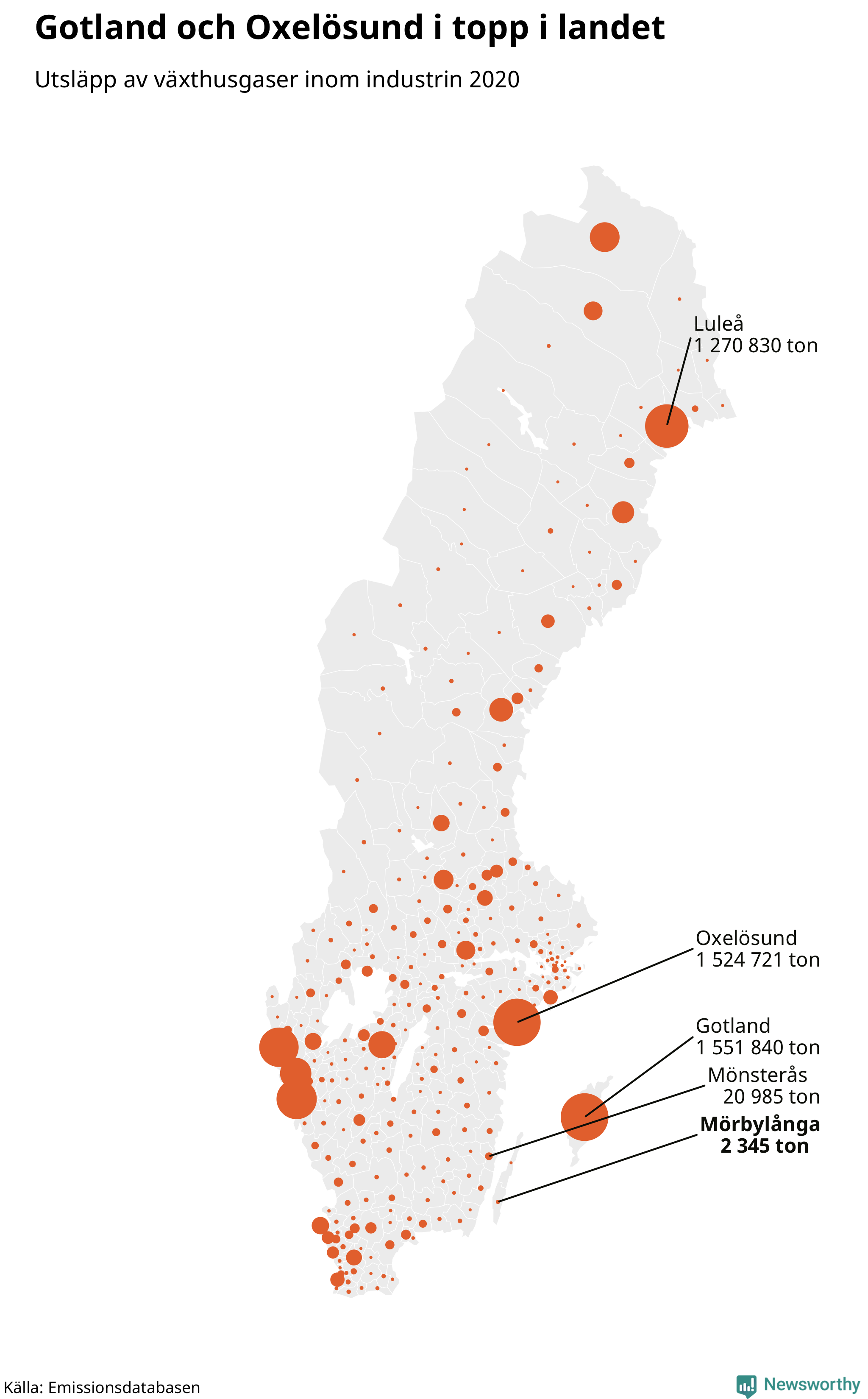 Precis som inrikes transporter står industrin för ungefär en tredjedel av Sveriges territoriella utsläpp. Men de utsläppen är betydligt mer ojämnt spridda över landet. 70 procent av utsläppen av växthusgaser från industri släpps ut i tio kommuner och i riket har utsläppen minskat med 28 procent sedan 2010. Industrin står för 2 345 ton i Mörbylånga kommun, vilket är en relativt liten del av utsläppen, 2 procent. Utsläppen har minskat med 99 procent jämfört med 2010.Mest industriutsläpp i Kalmar län skedde i Mönsterås kommun under 2020, som tillhör den tredjedel av kommuner i landet som har största industriutsläpp.