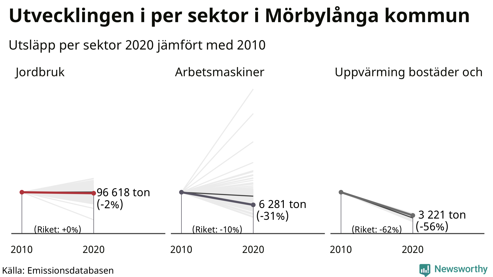 Räknar man alla växthusgaser som släpptes ut i Mörbylånga 2020 står jordbrukssektorn för 96 618 ton, vilket motsvarar 69 procent av de territoriella utsläppen i kommunen. Det är en sektor där utsläppen legat relativt still under de senaste tio åren.