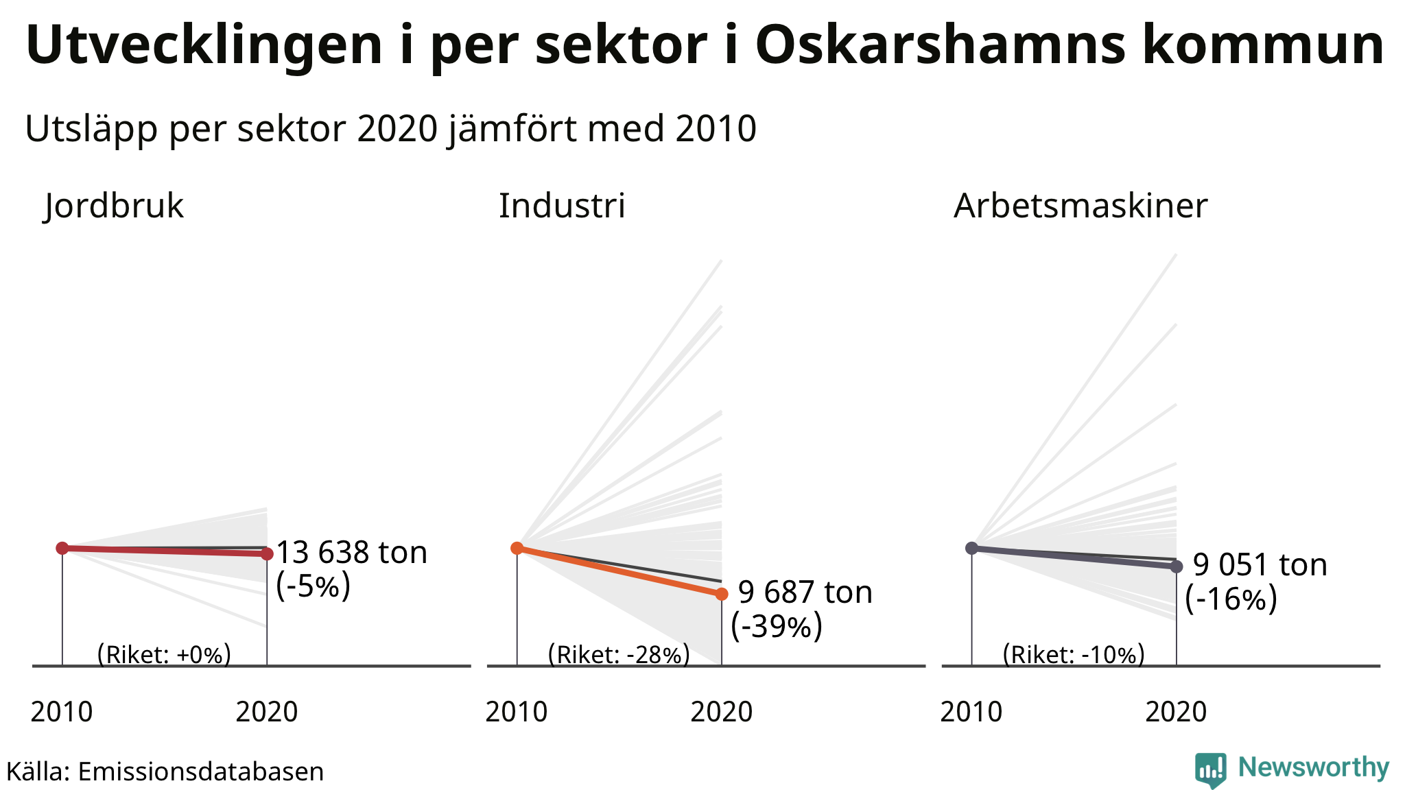 Precis som inrikes transporter står industrin för ungefär en tredjedel av Sveriges territoriella utsläpp. Men de utsläppen är betydligt mer ojämnt spridda över landet. 70 procent av utsläppen av växthusgaser från industri släpps ut i tio kommuner och i riket har utsläppen minskat med 28 procent sedan 2010. Industrin står för 9 687 ton i Oskarshamns kommun, vilket är en relativt liten del av utsläppen, 10 procent. Utsläppen har minskat med 39 procent jämfört med 2010.Mest industriutsläpp i Kalmar län skedde i Mönsterås kommun under 2020, som tillhör den tredjedel av kommuner i landet som har största industriutsläpp.