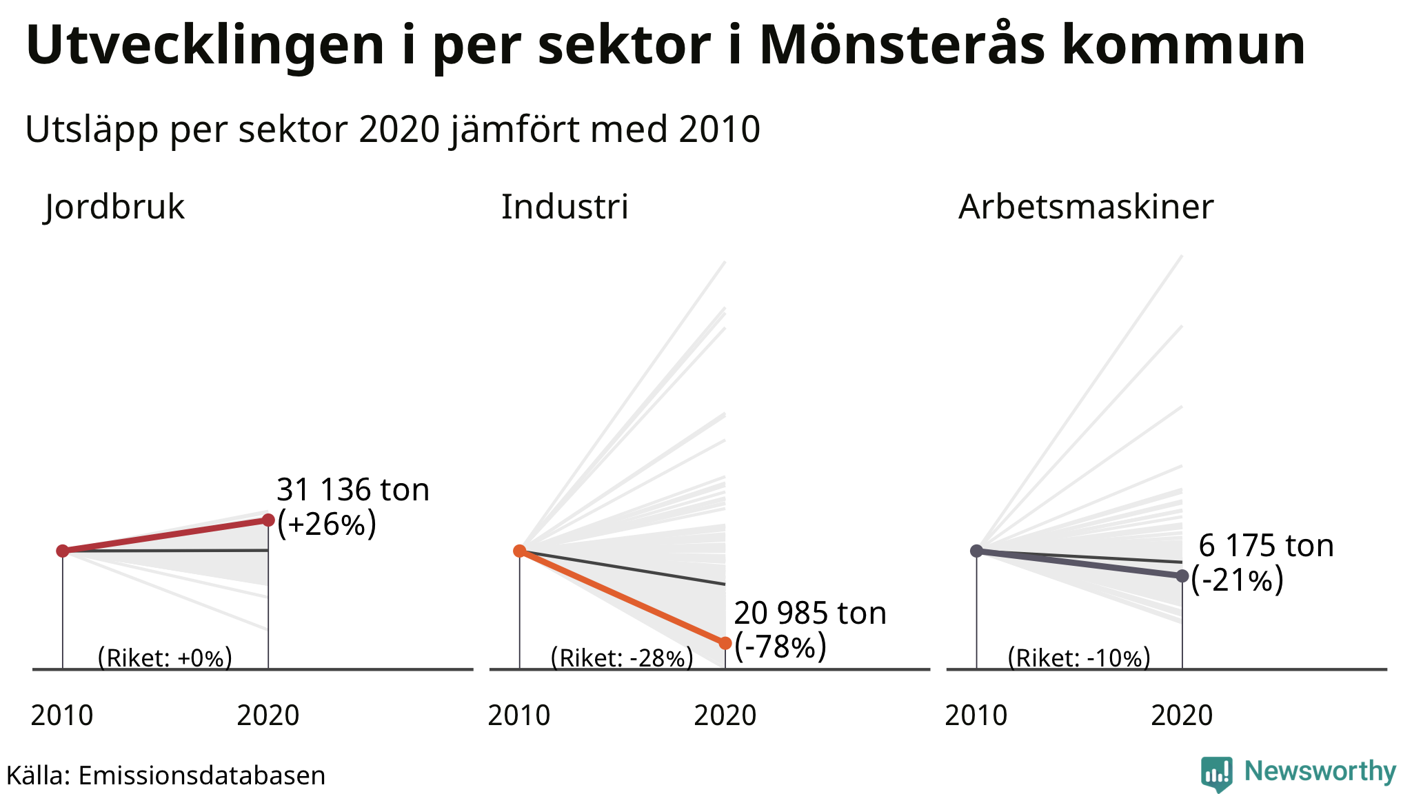 Räknar man alla växthusgaser som släpptes ut i Mönsterås 2020 står jordbrukssektorn för 31 136 ton, vilket motsvarar 34 procent av de territoriella utsläppen i kommunen. Det är också en sektor där utsläppen legat relativt still i Sverige de senaste tio åren, medan de ökat något i Mönsterås.