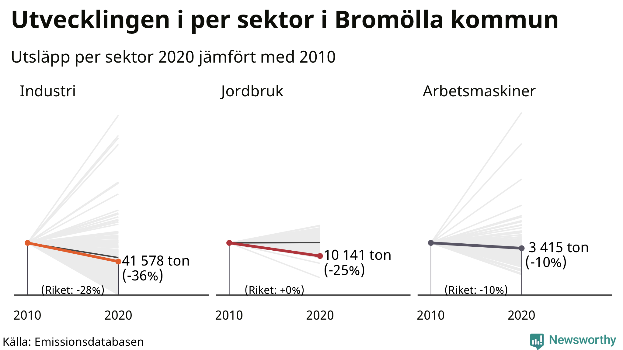 Sedan 2010 har utsläppen från industrin i Bromölla minskat med 36 procent. I landet som helhet har utsläppen från sektorn minskat med 28 procent.