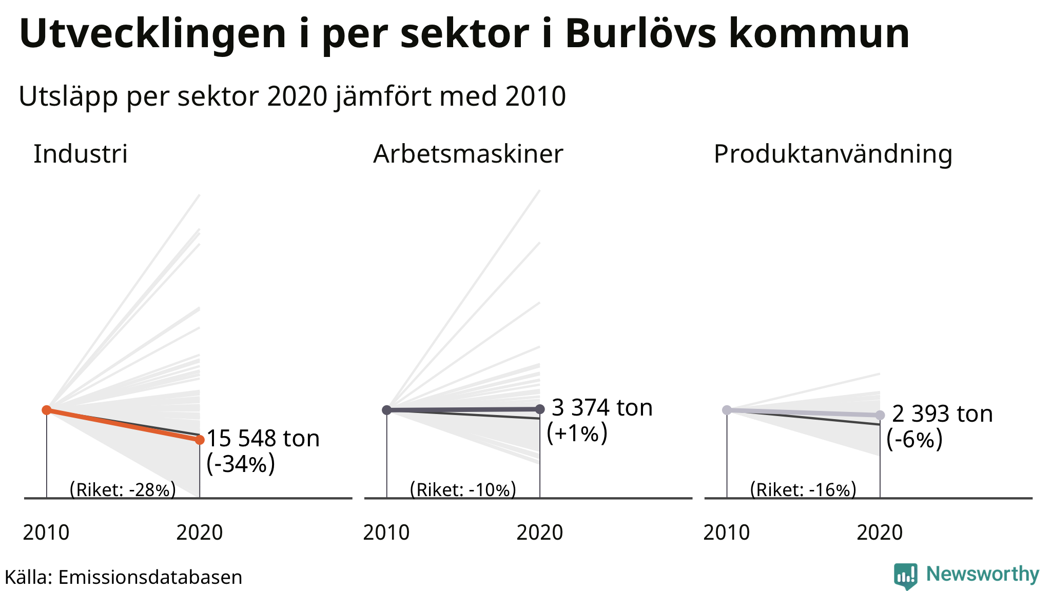 Precis som inrikes transporter står industrin för ungefär en tredjedel av Sveriges territoriella utsläpp. Men de utsläppen är betydligt mer ojämnt spridda över landet. 70 procent av utsläppen av växthusgaser från industri släpps ut i tio kommuner och i riket har utsläppen minskat med 28 procent sedan 2010. Burlöv tillhör inte kommunerna med störst utsläpp, enligt SMHI:s siffror stod industrin i kommunen för 15 548 ton, eller 24 procent av utsläppen, 2020. Utsläppen har minskat med 34 procent jämfört med 2010.Mest industriutsläpp i Skåne län skedde i Höganäs kommun under 2020, som tillhörde de kommuner i landet som har störst industriutsläpp.