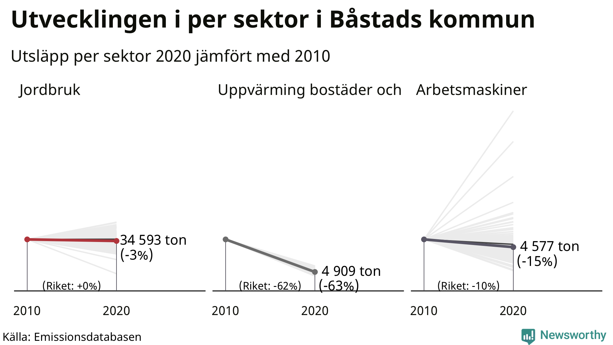 Räknar man alla växthusgaser som släpptes ut i Båstad 2020 står jordbrukssektorn för 34 593 ton, vilket motsvarar 44 procent av de territoriella utsläppen i kommunen. Det är en sektor där utsläppen i kommunen minskat de senaste åren, medan legat relativt still under de senaste åren.