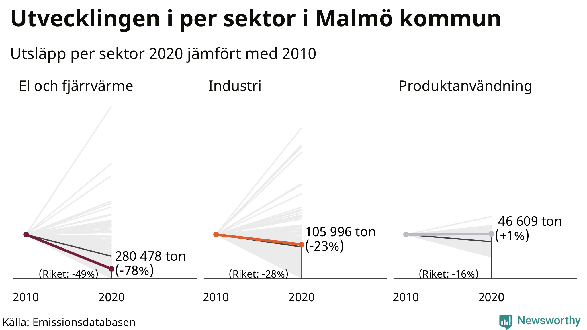 Utsläpp av växthusgaser från el och fjärrvärme stod för 38 procent (280 478 ton) av de totala territoriella utsläppen i Malmö kommun 2020. Därmed är kommunen en av sju där sektorn står för de största utsläppen av växthusgaser. Jämfört med 2010 – som visserligen var en kall vinter – har utsläppen inom sektorn minskat med 78 procent.