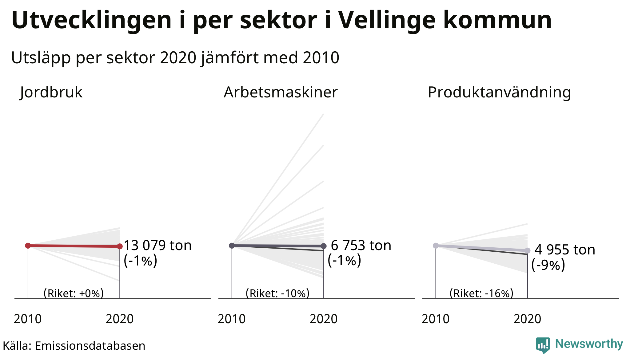 Sedan 1990 har utsläppen av växhusgaser minskat med 31 procent i Vellinge kommun. Störst minskning står industri för – 6 792 ton 1990 jämfört med 912 ton 2020. Även utsläppen från uppvärming av bostäder och lokaler har minskat stort i kommunen, precis som i hela riket, i takt med att oljepannor bytts ut mot andra uppvärmningsformer.