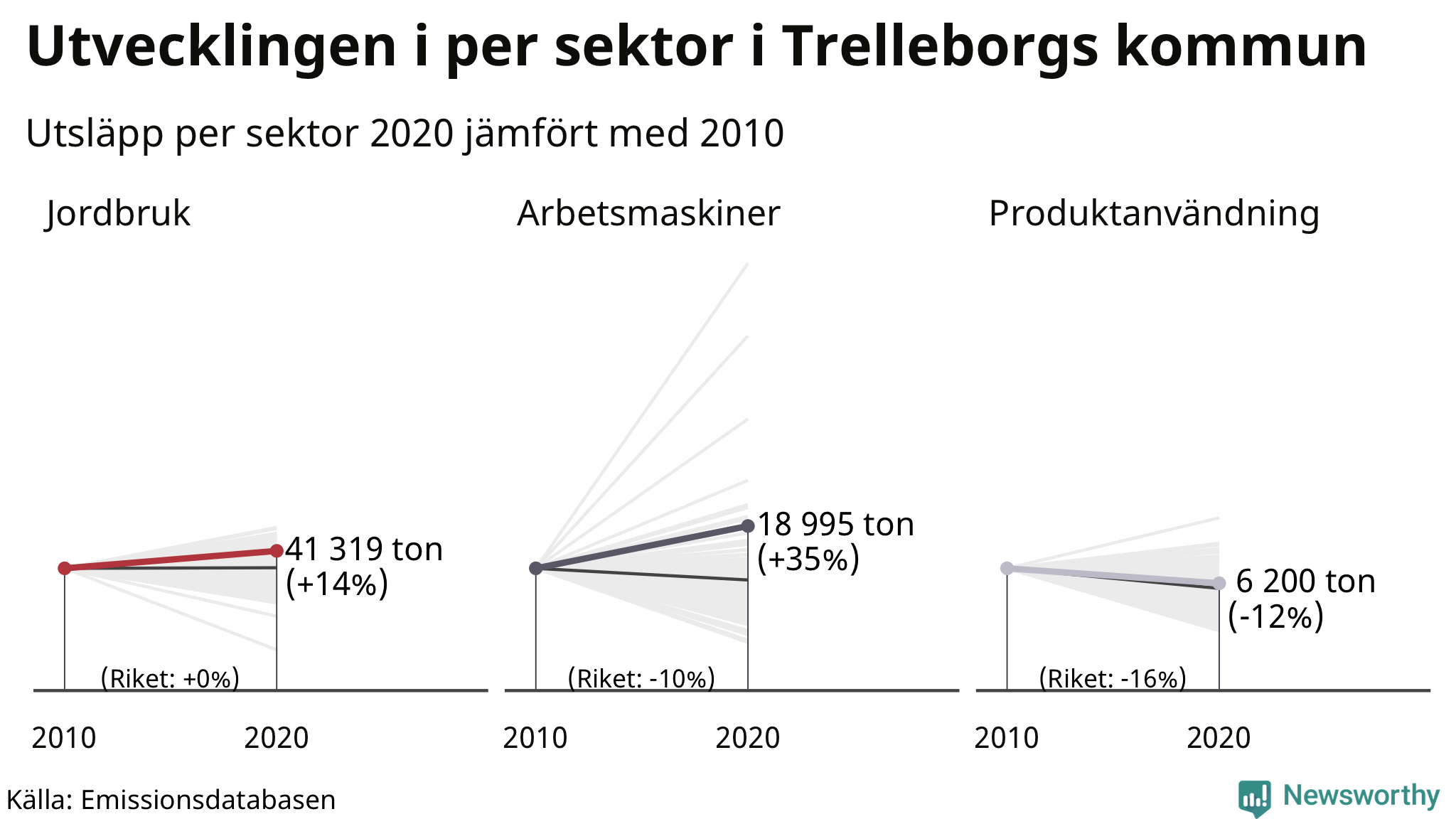 Efter transporter står jordbruket för störst territoriella utsläpp av växthustgaser i Trelleborg, 41 319 ton, eller 34 procent av utsläppen. Det är också en sektor där utsläppen legat relativt still i Sverige de senaste tio åren, medan de ökat något i Trelleborg.