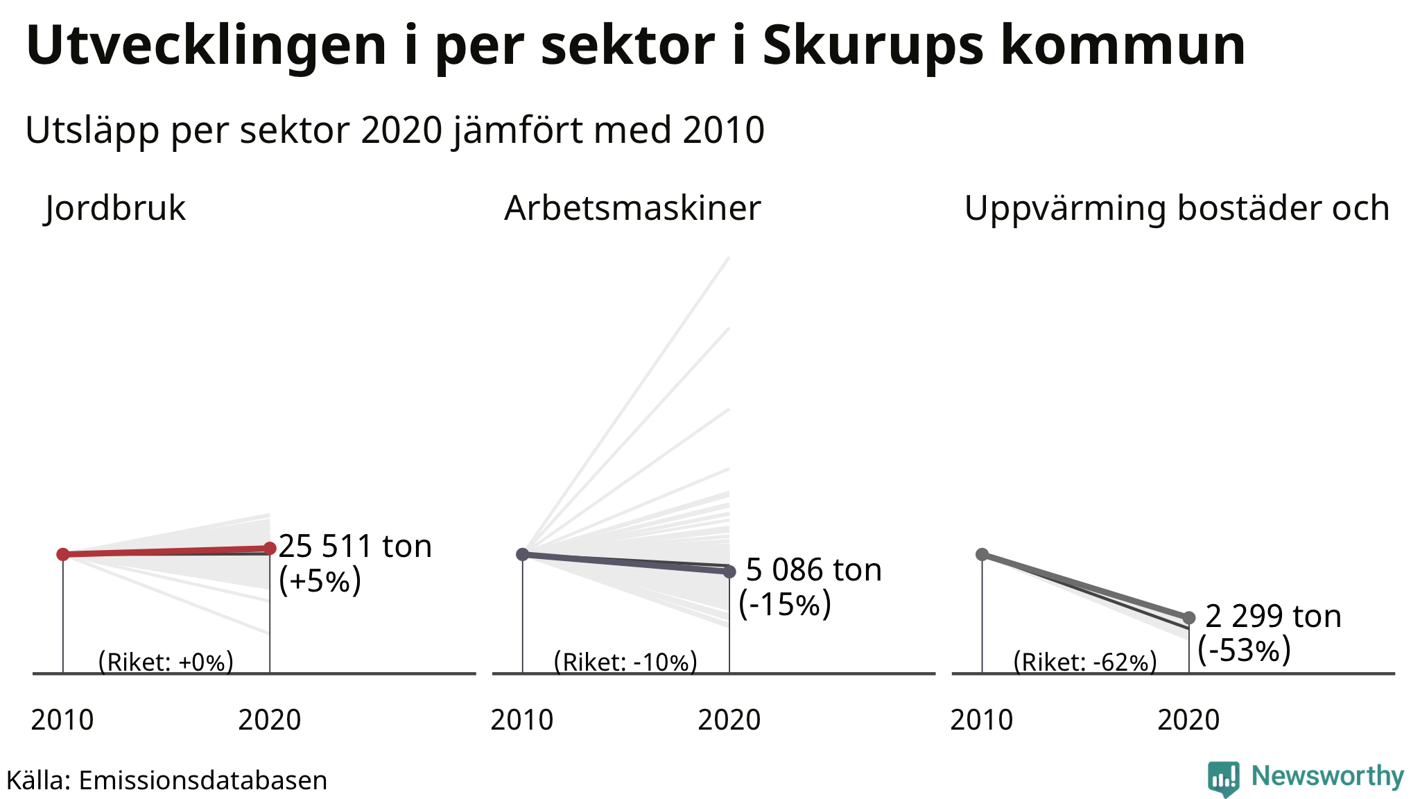 Räknar man alla växthusgaser som släpptes ut i Skurup 2020 står jordbrukssektorn för 25 511 ton, vilket motsvarar 43 procent av de territoriella utsläppen i kommunen. Det är också en sektor där utsläppen legat relativt still i Sverige de senaste tio åren, medan de ökat något i Skurup.