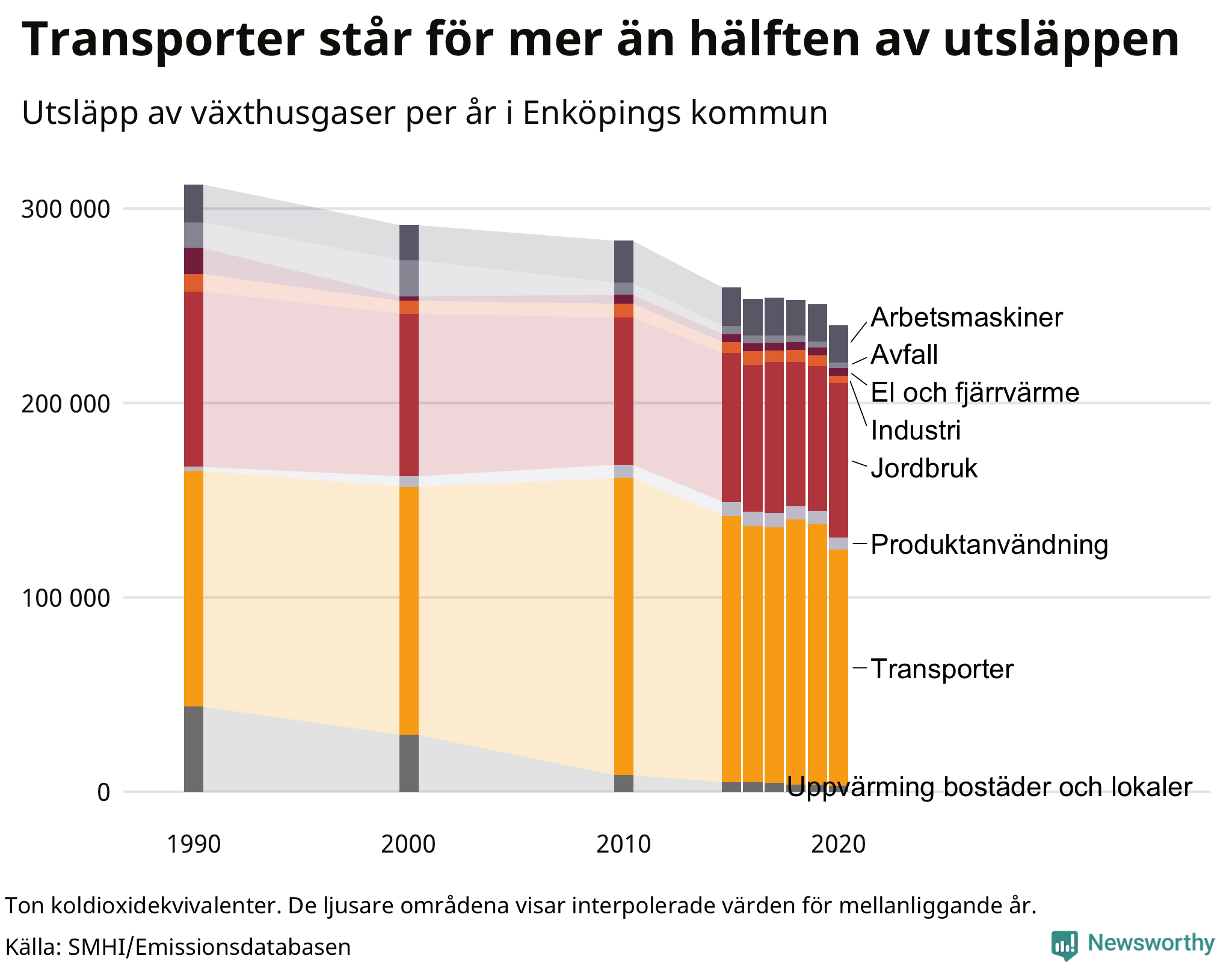 Utsläppen av växthusgaser minskade – precis som i riket i stort – i Enköpings kommun 2020. Det visar SMHI:s nya, regionala utsläppssiffror. Totalt släpptes 239 958 ton koldioxidekvivalenter ut i kommunen – en minskning med 4 procent jämfört med året innan. Störst var minskningen inom transportsektorn, som fortfarande är den största utsläppssektorn i kommunen – trots en minskning på 12 841 ton.
