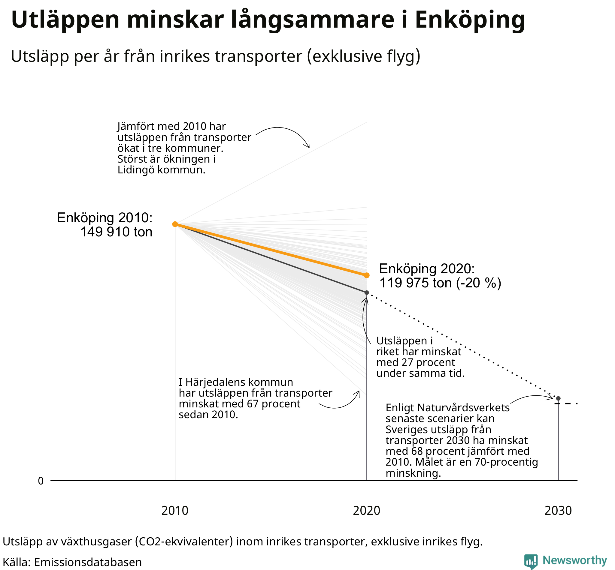 I klimatlagen finns ett delmål där utsläppen från inrikes transporter ska ha minskat med 70 procent år 2030 jämfört med 2010. Här räknas inte inrikesflyget – som omfattas av utsläppshandeln – in. Om man räknar på det sättet har utsläppen i Enköping minskat med 20 procent sedan 2010, vilket är långsammare än i riket i stort.